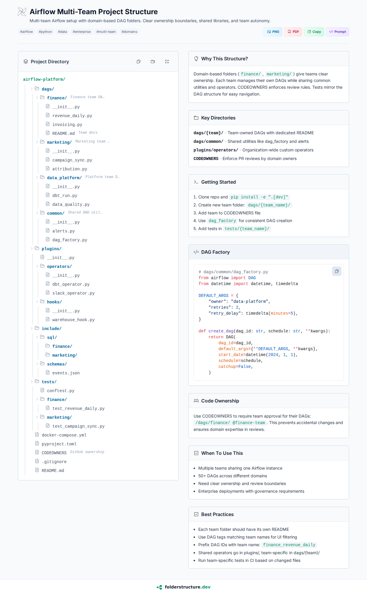 Multi-team Airflow setup with domain-based DAG folders. Clear ownership boundaries, shared libraries, and team autonomy.
