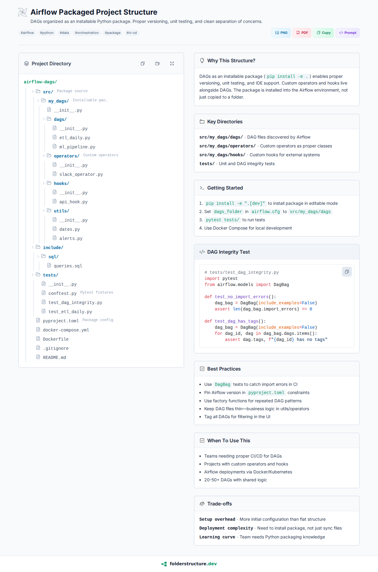 DAGs organized as an installable Python package. Proper versioning, unit testing, and clean separation of concerns.