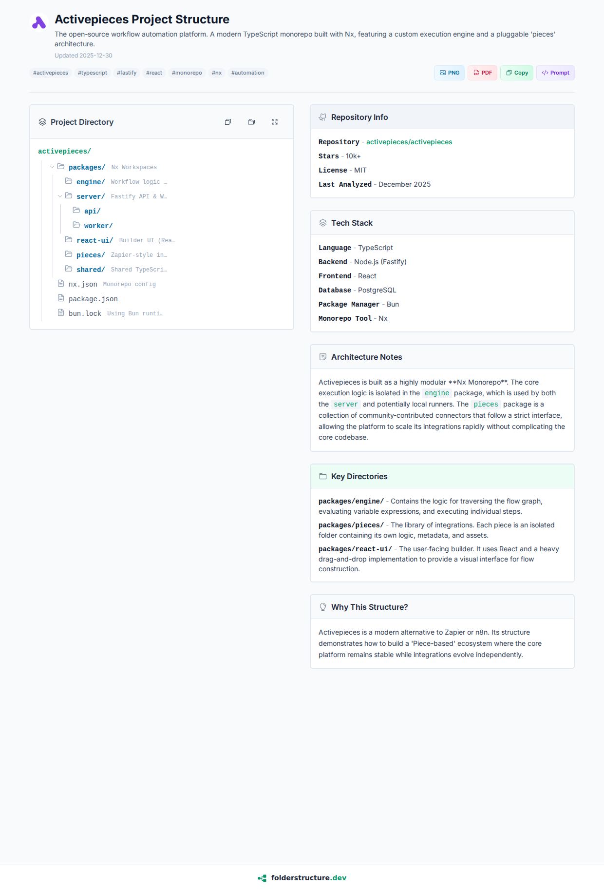 Activepieces is a modern alternative to Zapier or n8n. Its structure demonstrates how to build a 'Piece-based' ecosystem where the core platform remains stable while integrations evolve independently.