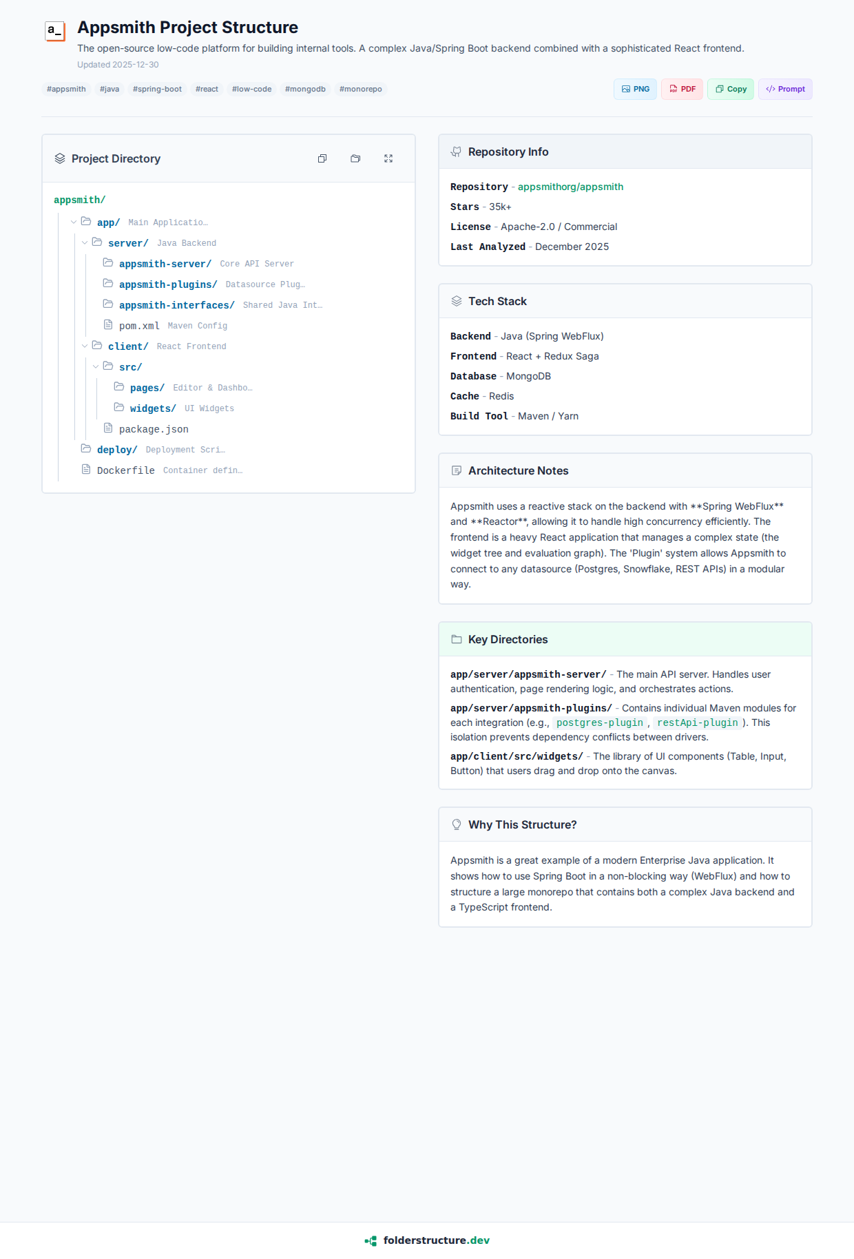 Appsmith uses a reactive stack on the backend with **Spring WebFlux** and **Reactor**, allowing it to handle high concurrency efficiently. The frontend is a heavy React application that manages a complex state (the widget tree and evaluation graph). The 'Plugin' system allows Appsmith to connect to any datasource (Postgres, Snowflake, REST APIs) in a modular way.