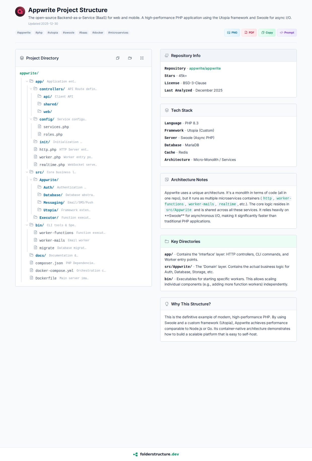 Appwrite uses a unique architecture. It's a monolith in terms of code (all in one repo), but it runs as multiple microservices containers (http, worker-functions, worker-mails, realtime, etc.). The core logic resides in src/Appwrite and is shared across all these services. It relies heavily on **Swoole** for asynchronous I/O, making it significantly faster than traditional PHP applications.