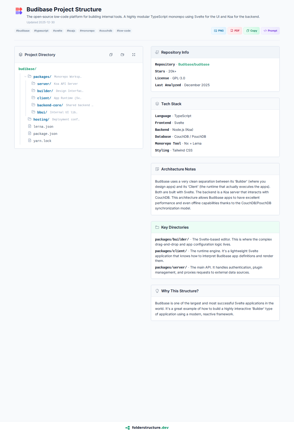 Budibase uses a very clean separation between its 'Builder' (where you design apps) and its 'Client' (the runtime that actually executes the apps). Both are built with Svelte. The backend is a Koa server that interacts with CouchDB. This architecture allows Budibase apps to have excellent performance and even offline capabilities thanks to the CouchDB/PouchDB synchronization model.