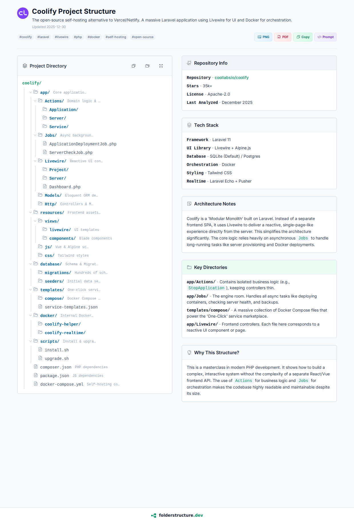 The open-source self-hosting alternative to Vercel/Netlify. A massive Laravel application using Livewire for UI and Docker for orchestration.
