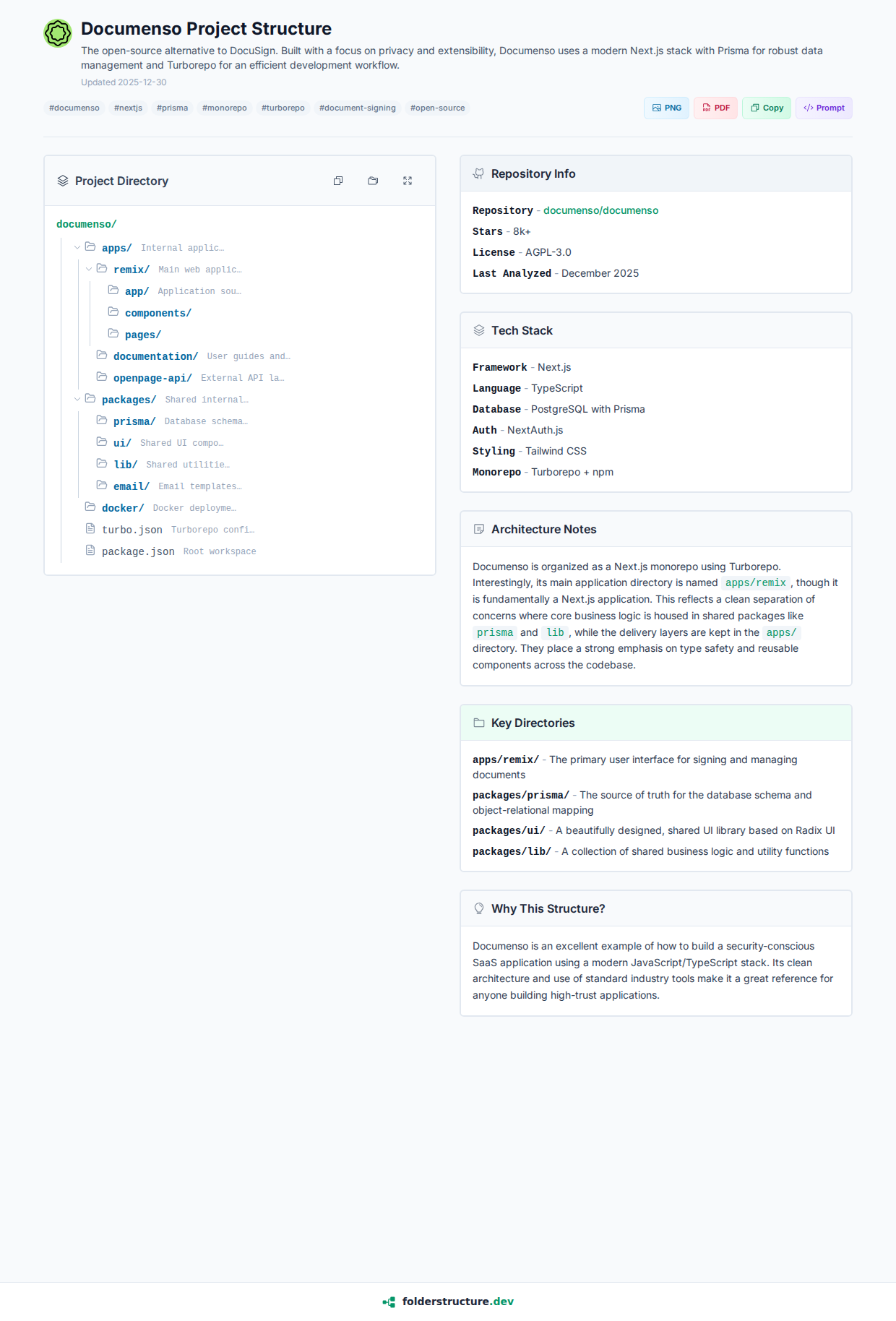 Documenso is an excellent example of how to build a security-conscious SaaS application using a modern JavaScript/TypeScript stack. Its clean architecture and use of standard industry tools make it a great reference for anyone building high-trust applications.