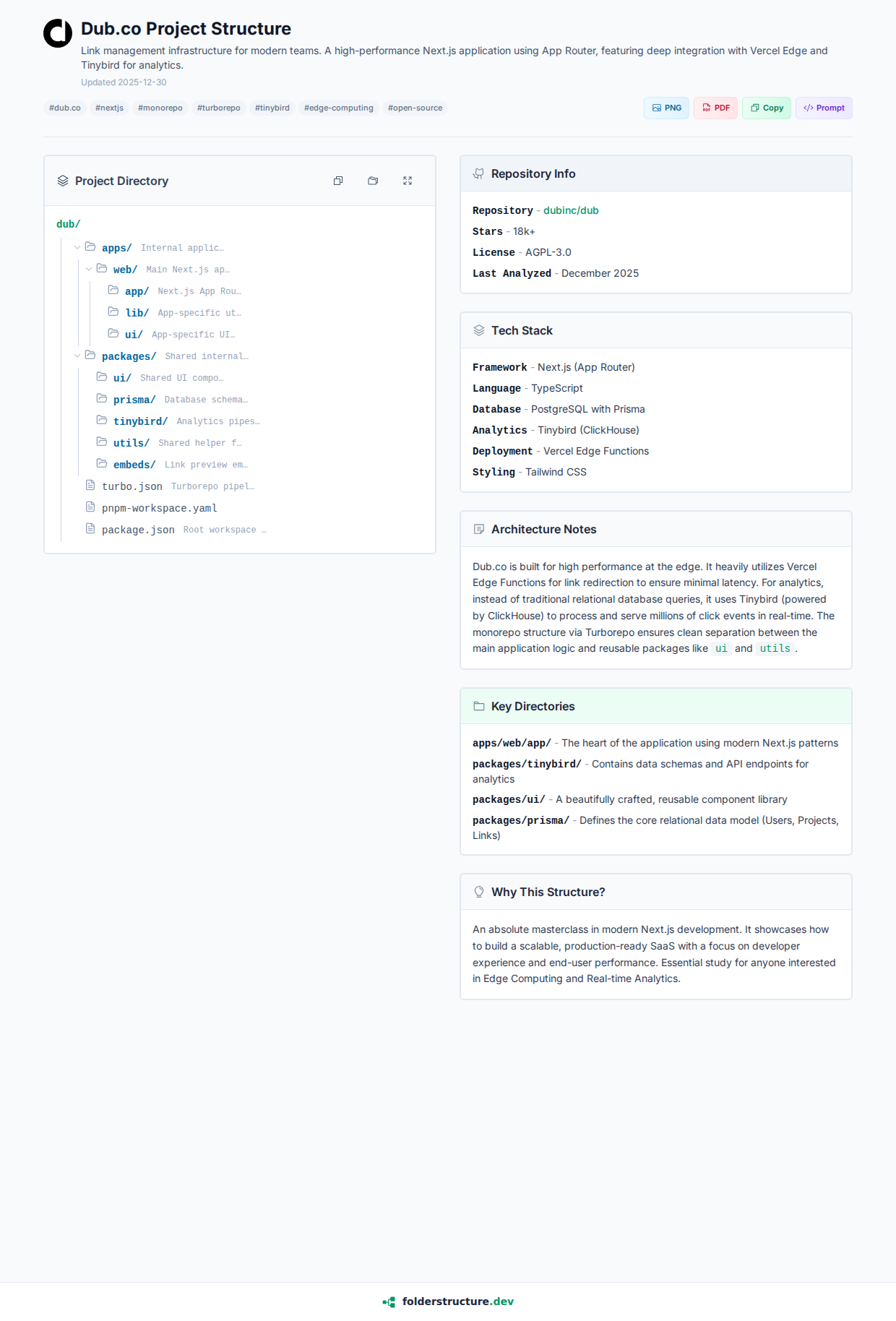 Dub.co is built for high performance at the edge. It heavily utilizes Vercel Edge Functions for link redirection to ensure minimal latency. For analytics, instead of traditional relational database queries, it uses Tinybird (powered by ClickHouse) to process and serve millions of click events in real-time. The monorepo structure via Turborepo ensures clean separation between the main application logic and reusable packages like ui and utils.