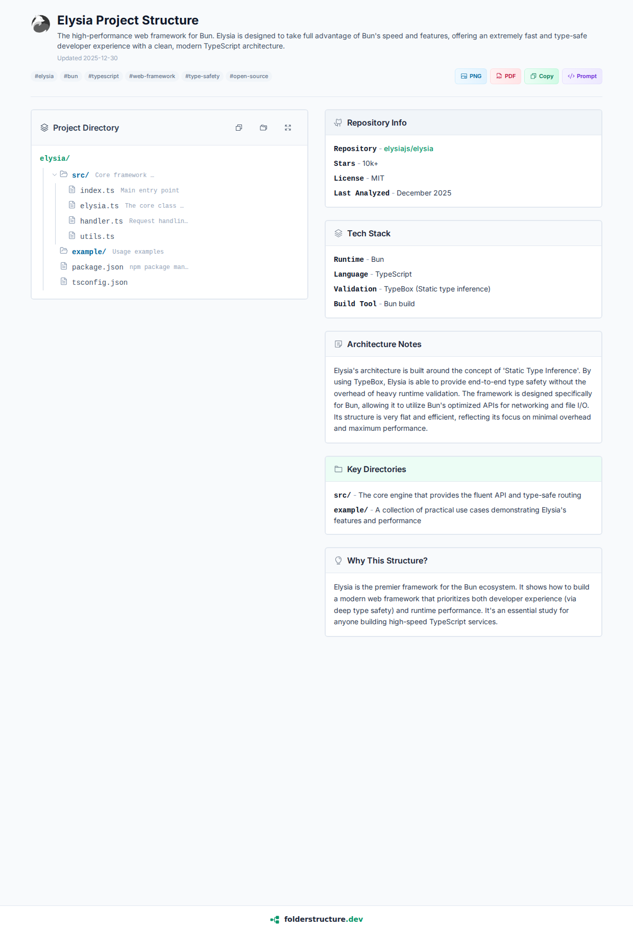Elysia's architecture is built around the concept of 'Static Type Inference'. By using TypeBox, Elysia is able to provide end-to-end type safety without the overhead of heavy runtime validation. The framework is designed specifically for Bun, allowing it to utilize Bun's optimized APIs for networking and file I/O. Its structure is very flat and efficient, reflecting its focus on minimal overhead and maximum performance.