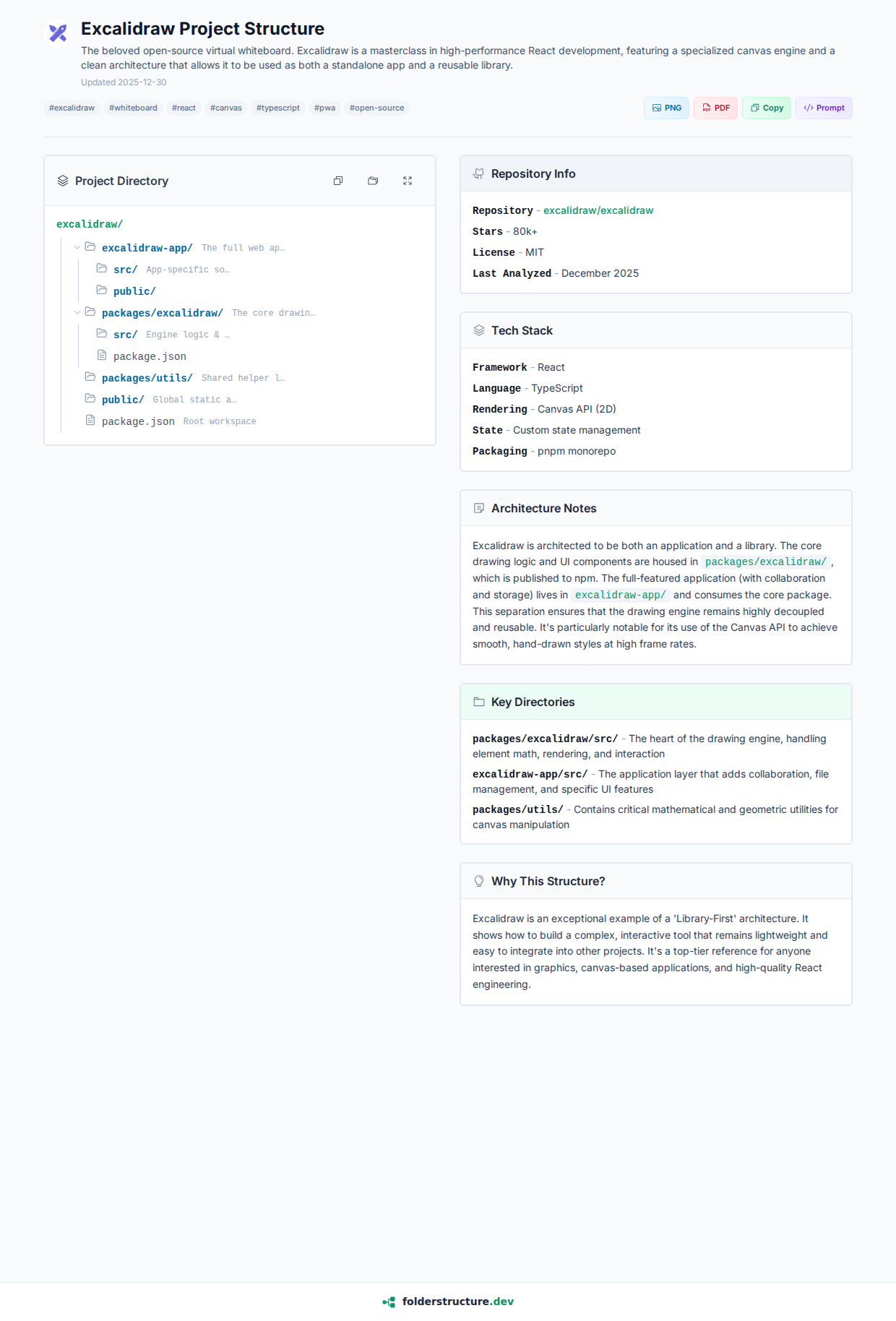 Excalidraw is an exceptional example of a 'Library-First' architecture. It shows how to build a complex, interactive tool that remains lightweight and easy to integrate into other projects. It's a top-tier reference for anyone interested in graphics, canvas-based applications, and high-quality React engineering.