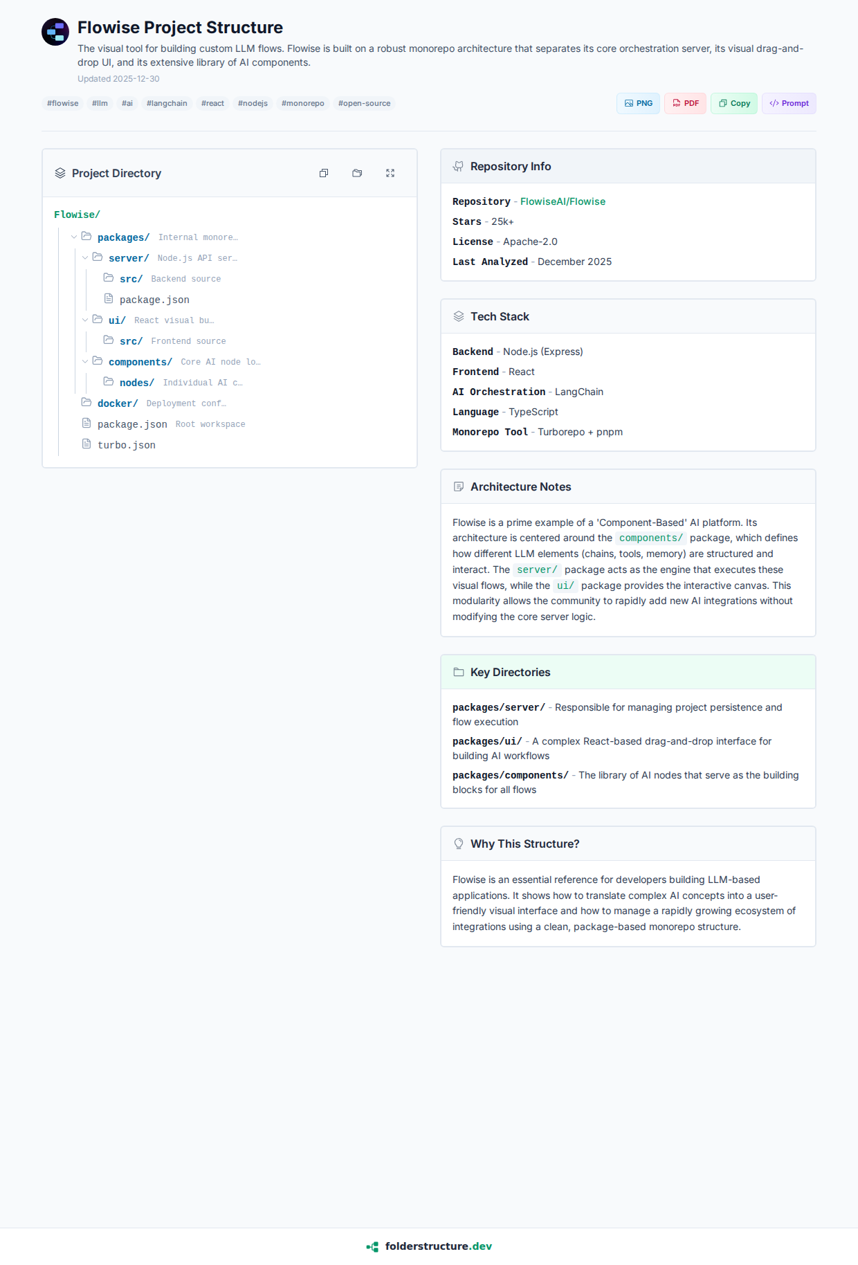 Flowise is an essential reference for developers building LLM-based applications. It shows how to translate complex AI concepts into a user-friendly visual interface and how to manage a rapidly growing ecosystem of integrations using a clean, package-based monorepo structure.