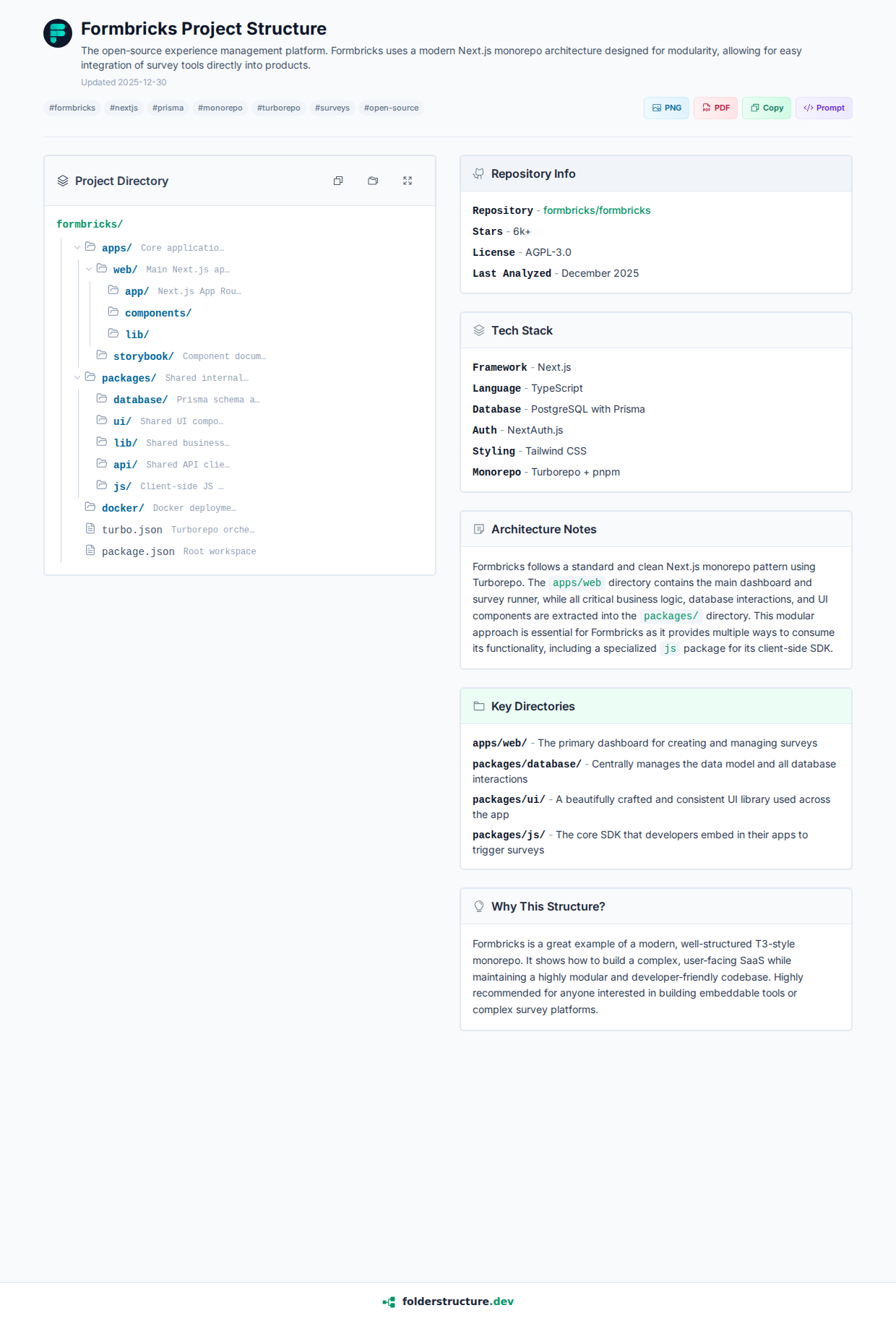 Formbricks follows a standard and clean Next.js monorepo pattern using Turborepo. The apps/web directory contains the main dashboard and survey runner, while all critical business logic, database interactions, and UI components are extracted into the packages/ directory. This modular approach is essential for Formbricks as it provides multiple ways to consume its functionality, including a specialized js package for its client-side SDK.