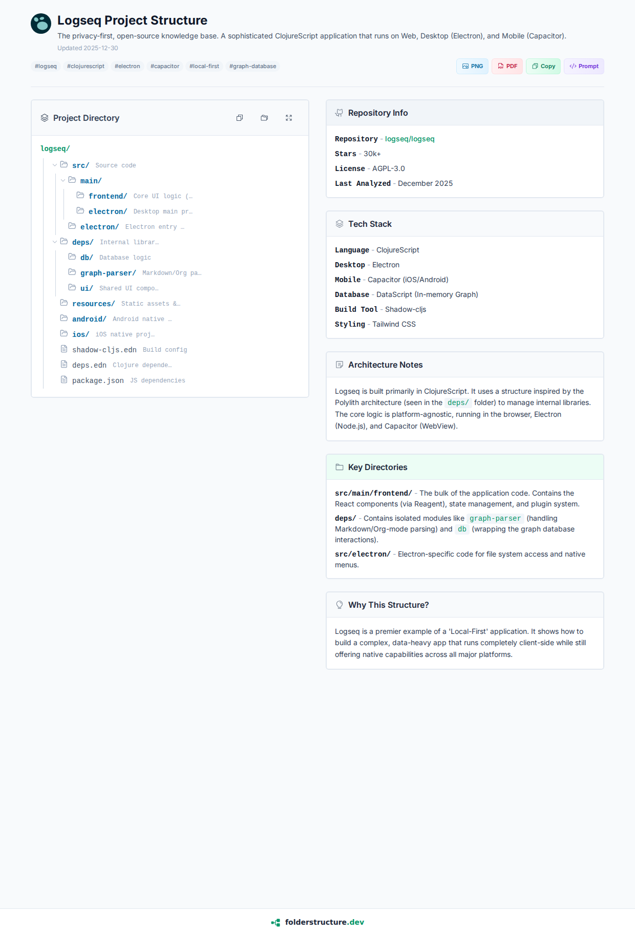 Logseq is built primarily in ClojureScript. It uses a structure inspired by the Polylith architecture (seen in the deps/ folder) to manage internal libraries. The core logic is platform-agnostic, running in the browser, Electron (Node.js), and Capacitor (WebView).