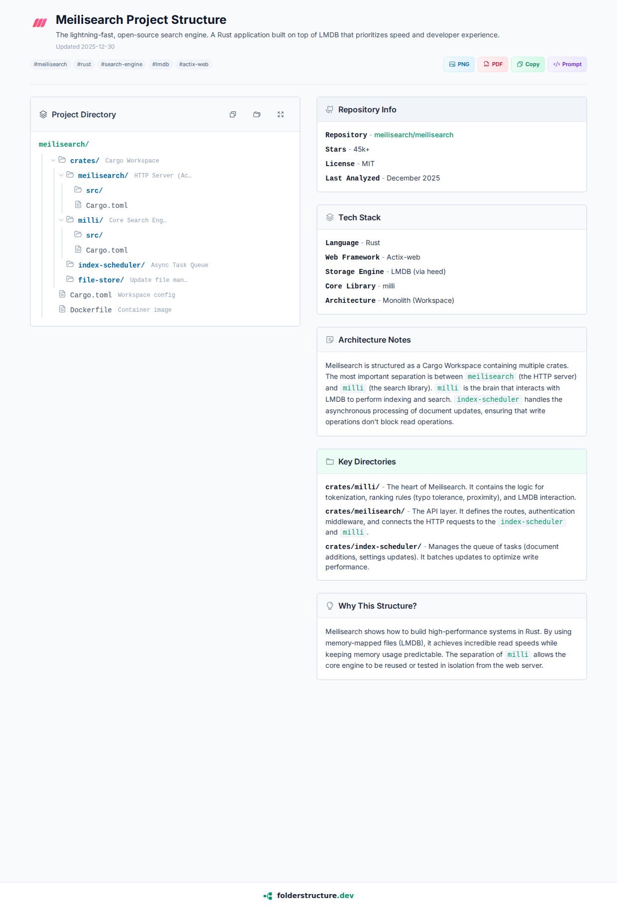 Meilisearch shows how to build high-performance systems in Rust. By using memory-mapped files (LMDB), it achieves incredible read speeds while keeping memory usage predictable. The separation of milli allows the core engine to be reused or tested in isolation from the web server.