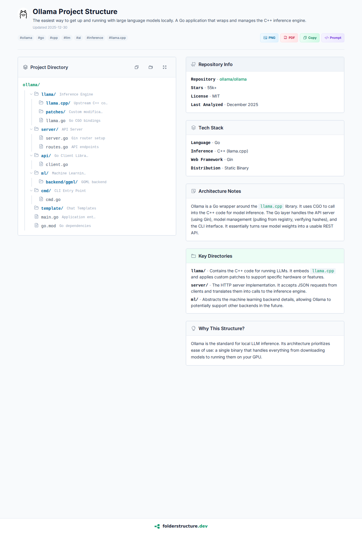 Ollama is a Go wrapper around the llama.cpp library. It uses CGO to call into the C++ code for model inference. The Go layer handles the API server (using Gin), model management (pulling from registry, verifying hashes), and the CLI interface. It essentially turns raw model weights into a usable REST API.