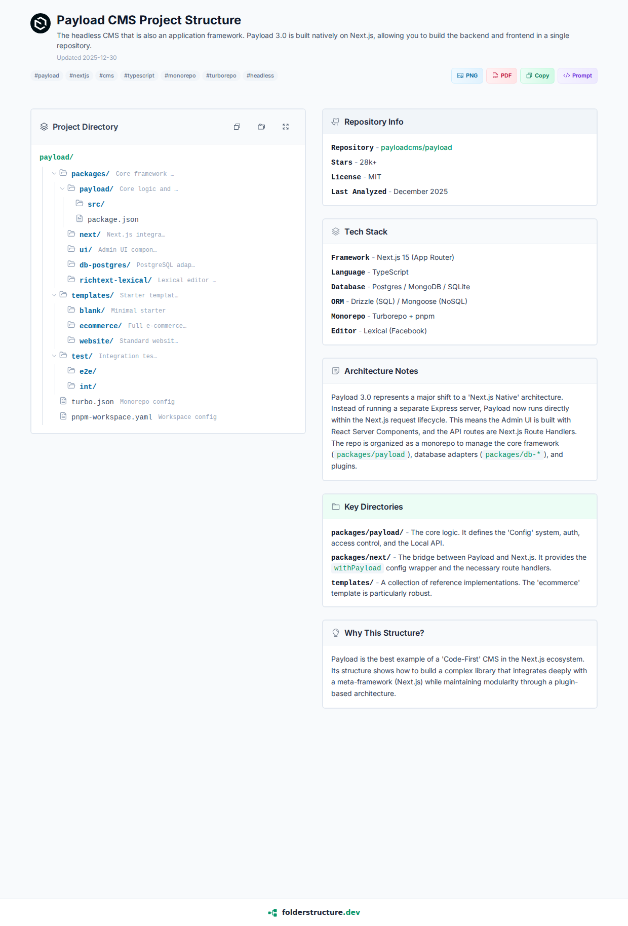 Payload is the best example of a 'Code-First' CMS in the Next.js ecosystem. Its structure shows how to build a complex library that integrates deeply with a meta-framework (Next.js) while maintaining modularity through a plugin-based architecture.