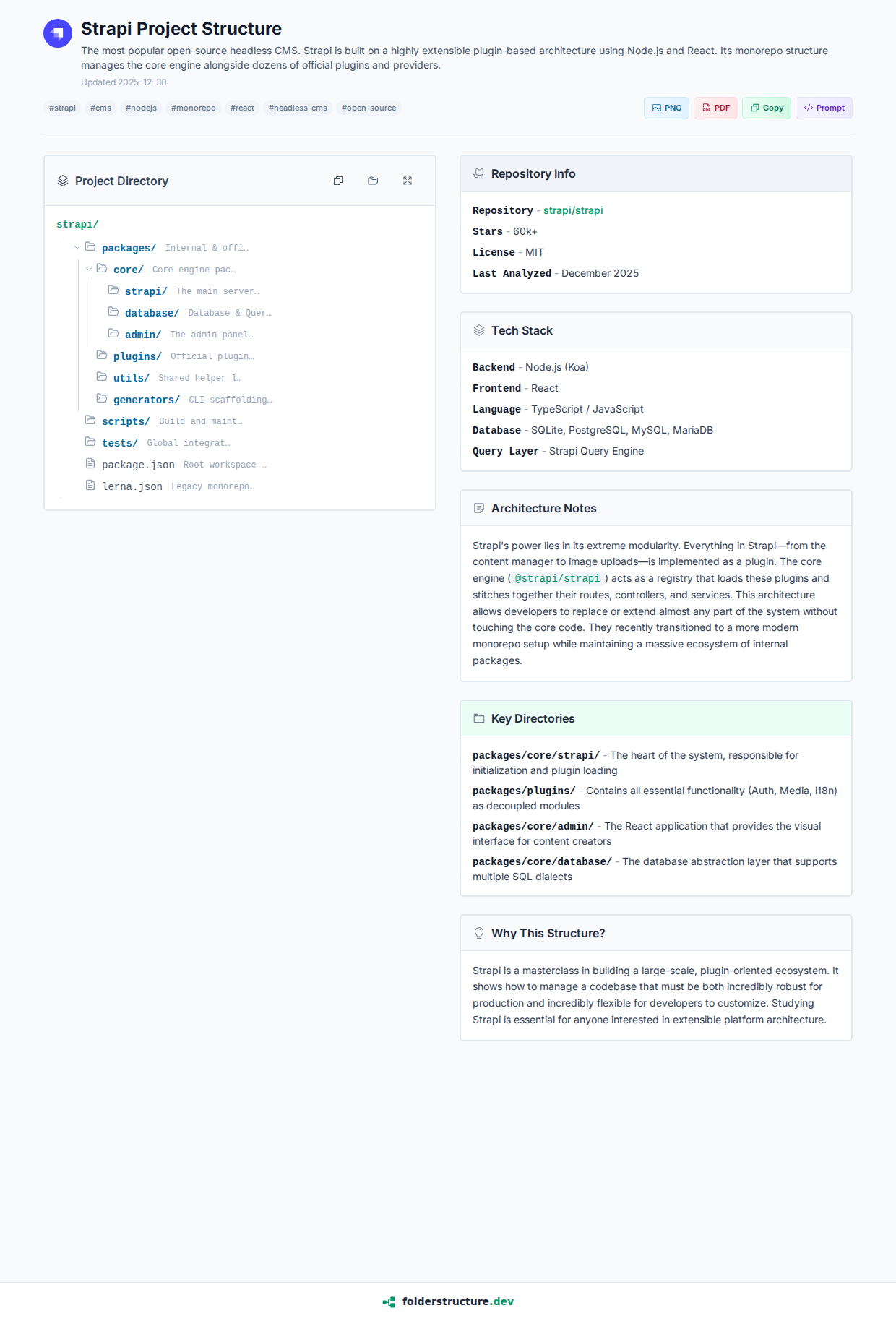 The most popular open-source headless CMS. Strapi is built on a highly extensible plugin-based architecture using Node.js and React. Its monorepo structure manages the core engine alongside dozens of official plugins and providers.