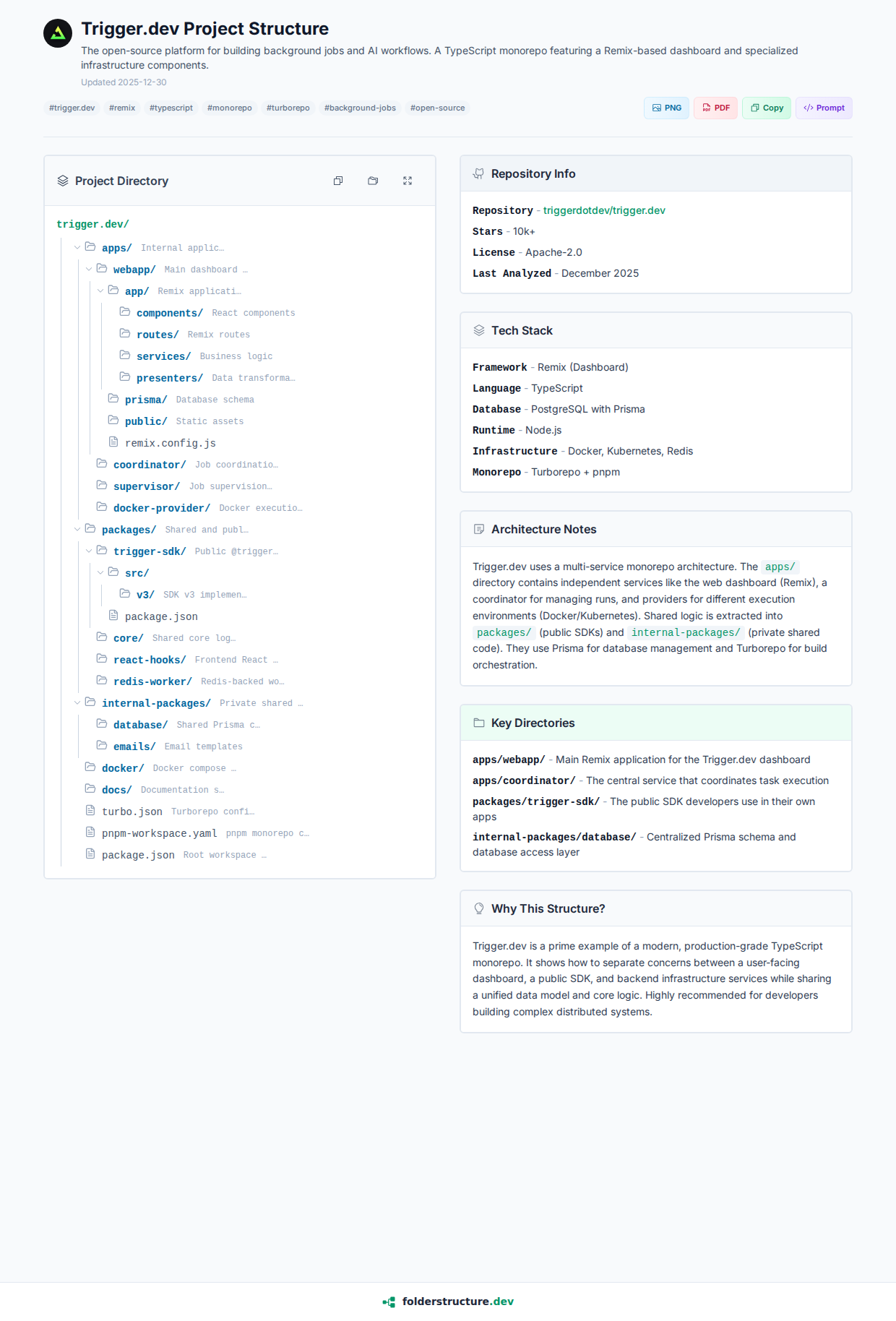 Trigger.dev is a prime example of a modern, production-grade TypeScript monorepo. It shows how to separate concerns between a user-facing dashboard, a public SDK, and backend infrastructure services while sharing a unified data model and core logic. Highly recommended for developers building complex distributed systems.