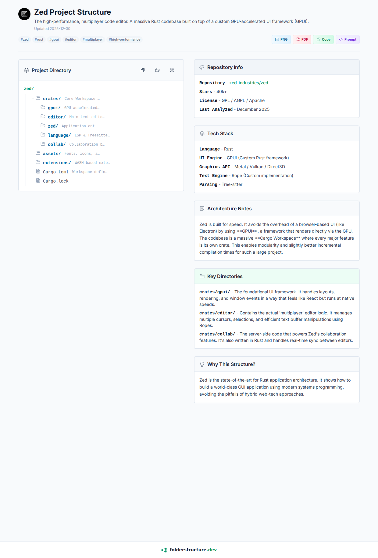 Zed is built for speed. It avoids the overhead of a browser-based UI (like Electron) by using **GPUI**, a framework that renders directly via the GPU. The codebase is a massive **Cargo Workspace** where every major feature is its own crate. This enables modularity and slightly better incremental compilation times for such a large project.