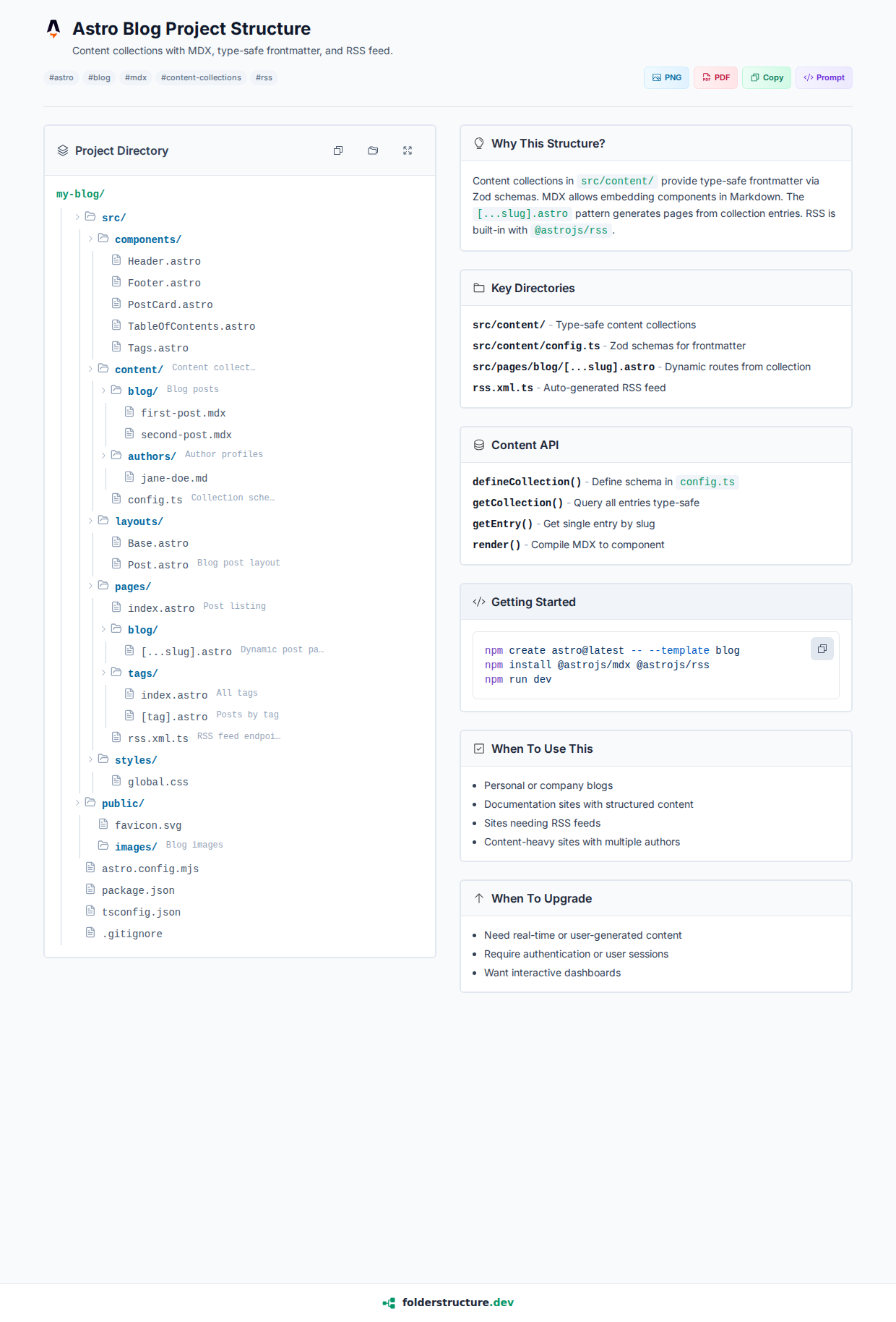 Content collections in src/content/ provide type-safe frontmatter via Zod schemas. MDX allows embedding components in Markdown. The [...slug].astro pattern generates pages from collection entries. RSS is built-in with @astrojs/rss.