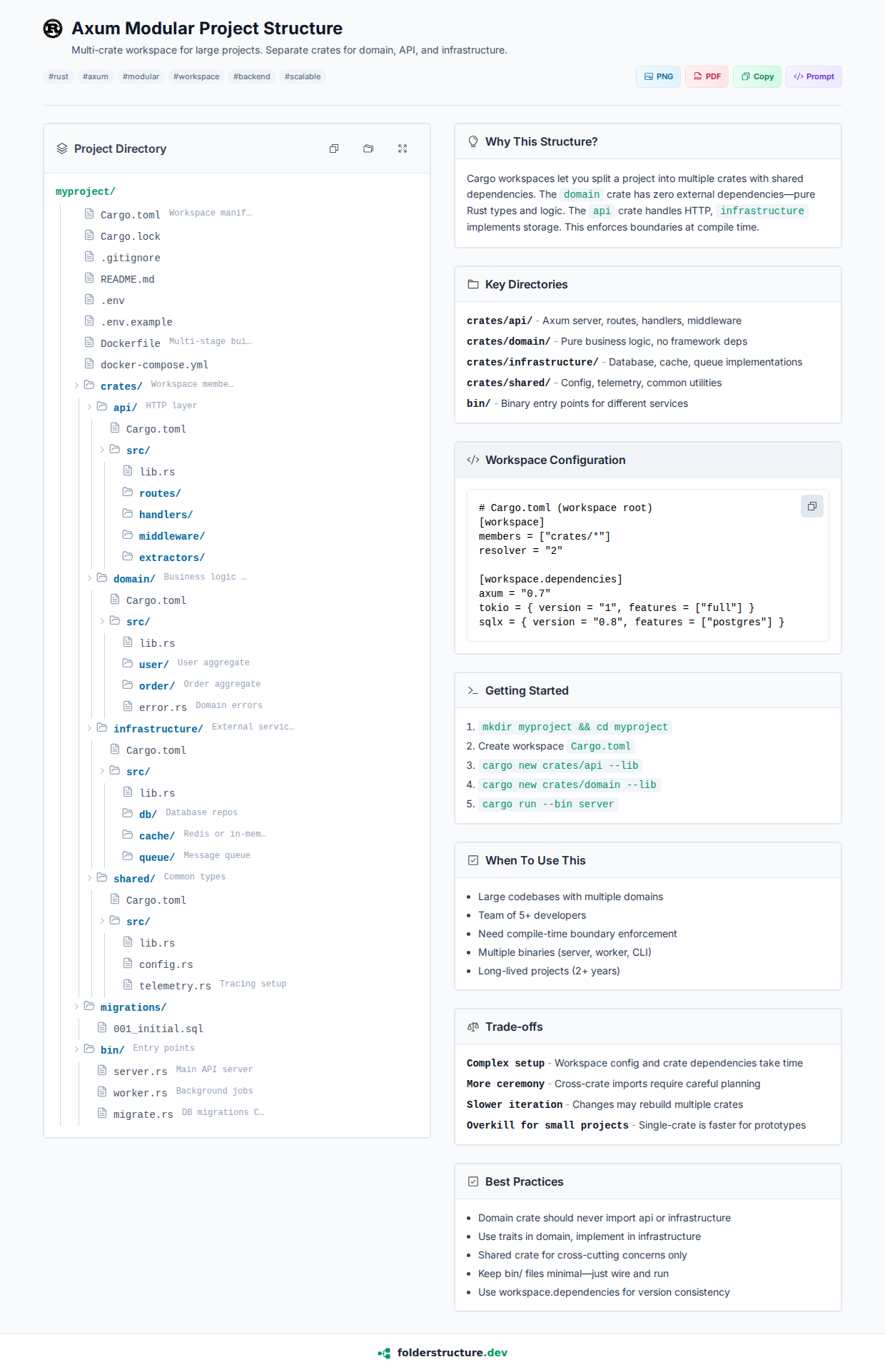 Cargo workspaces let you split a project into multiple crates with shared dependencies. The domain crate has zero external dependencies—pure Rust types and logic. The api crate handles HTTP, infrastructure implements storage. This enforces boundaries at compile time.