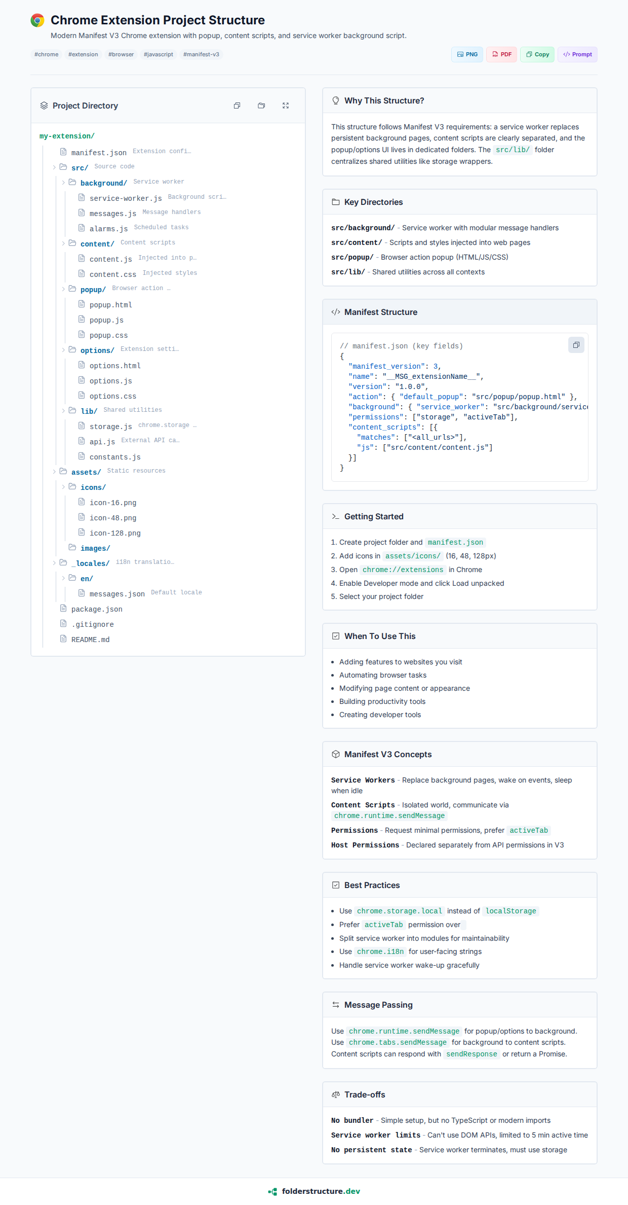 This structure follows Manifest V3 requirements: a service worker replaces persistent background pages, content scripts are clearly separated, and the popup/options UI lives in dedicated folders. The src/lib/ folder centralizes shared utilities like storage wrappers.