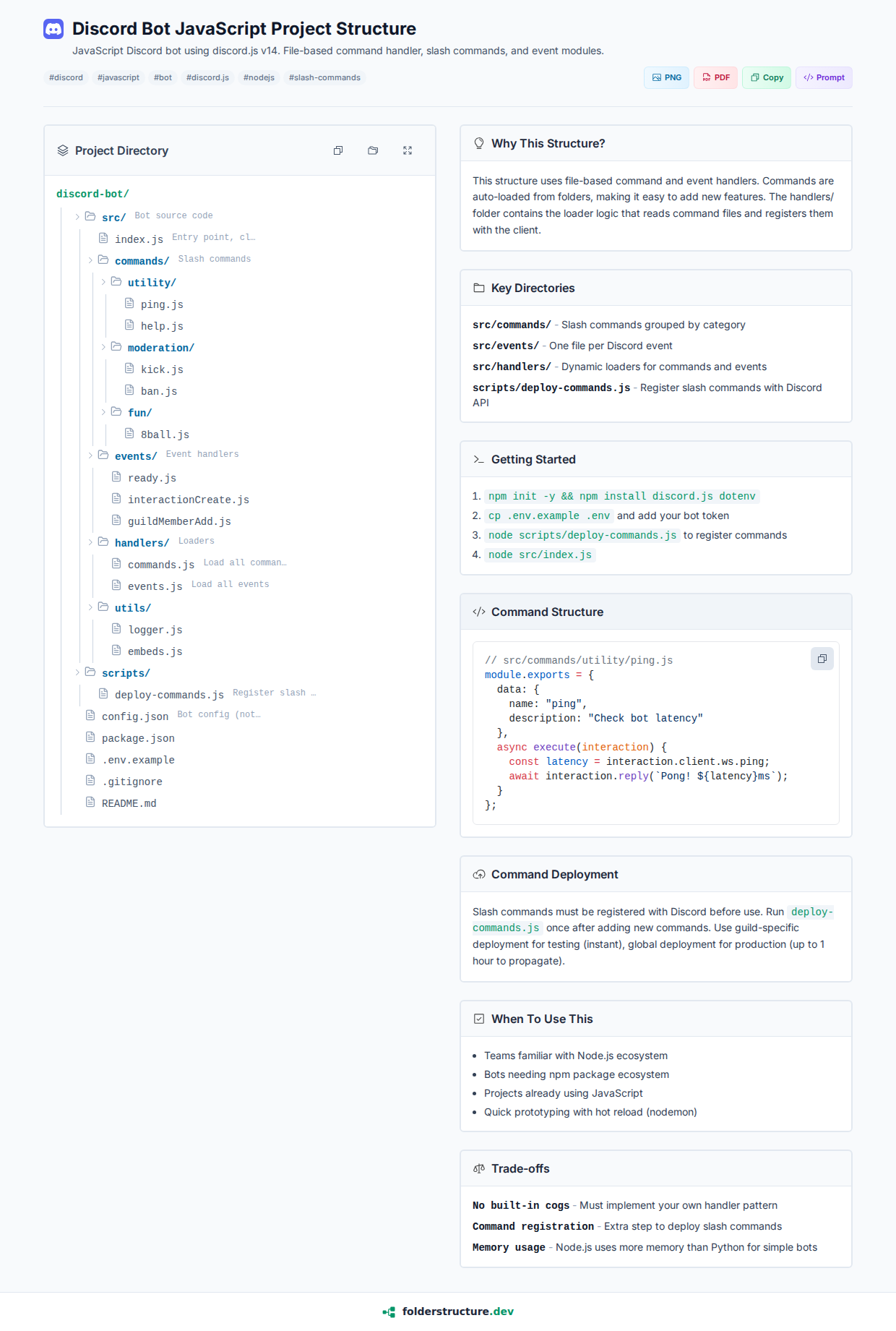JavaScript Discord bot using discord.js v14. File-based command handler, slash commands, and event modules.