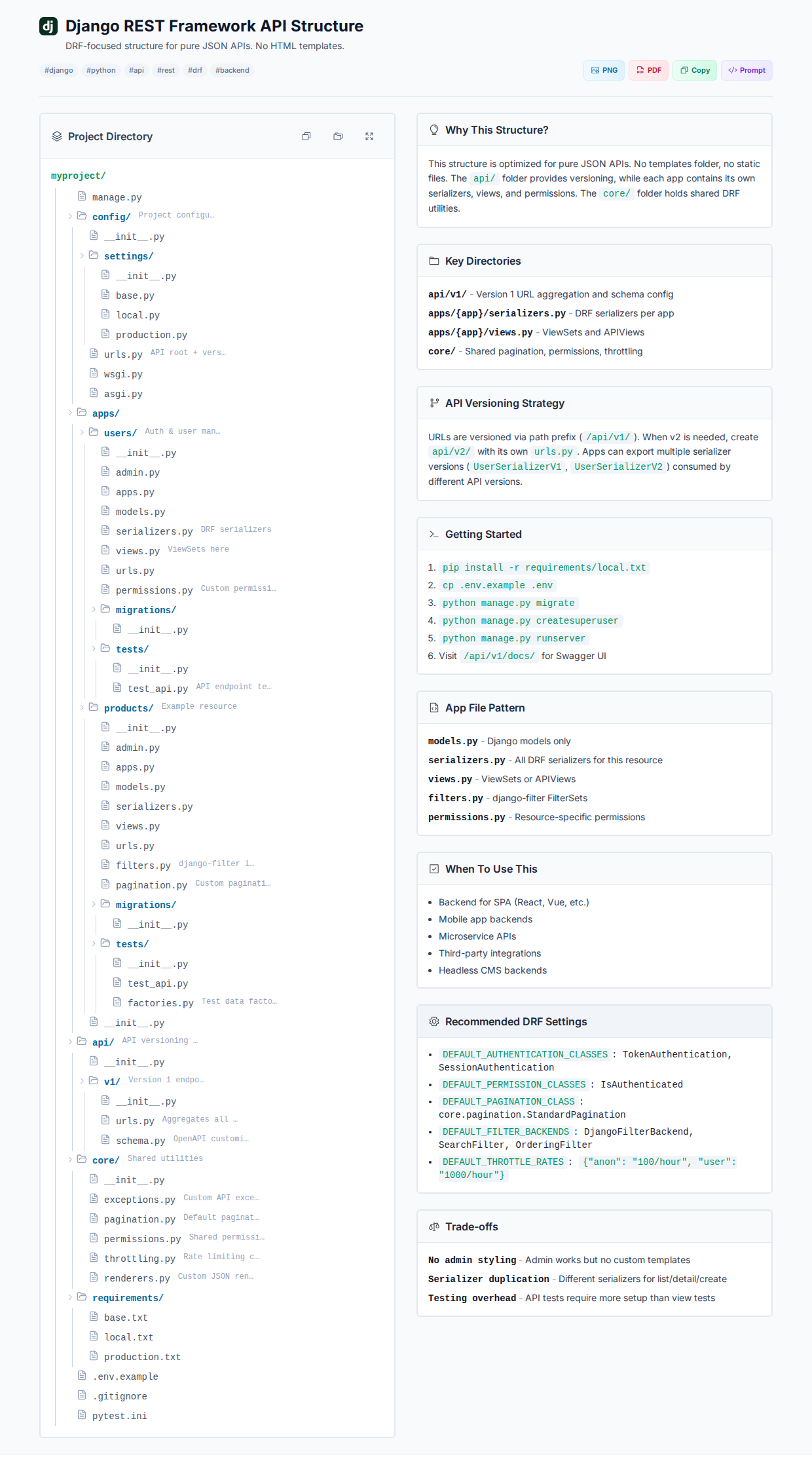 This structure is optimized for pure JSON APIs. No templates folder, no static files. The api/ folder provides versioning, while each app contains its own serializers, views, and permissions. The core/ folder holds shared DRF utilities.