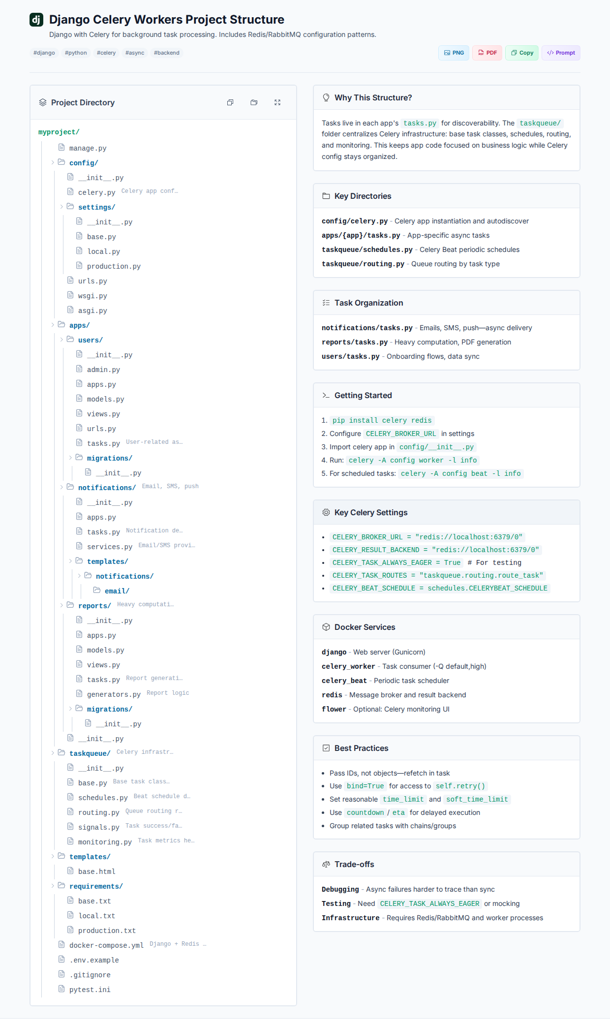 Django with Celery for background task processing. Includes Redis/RabbitMQ configuration patterns.