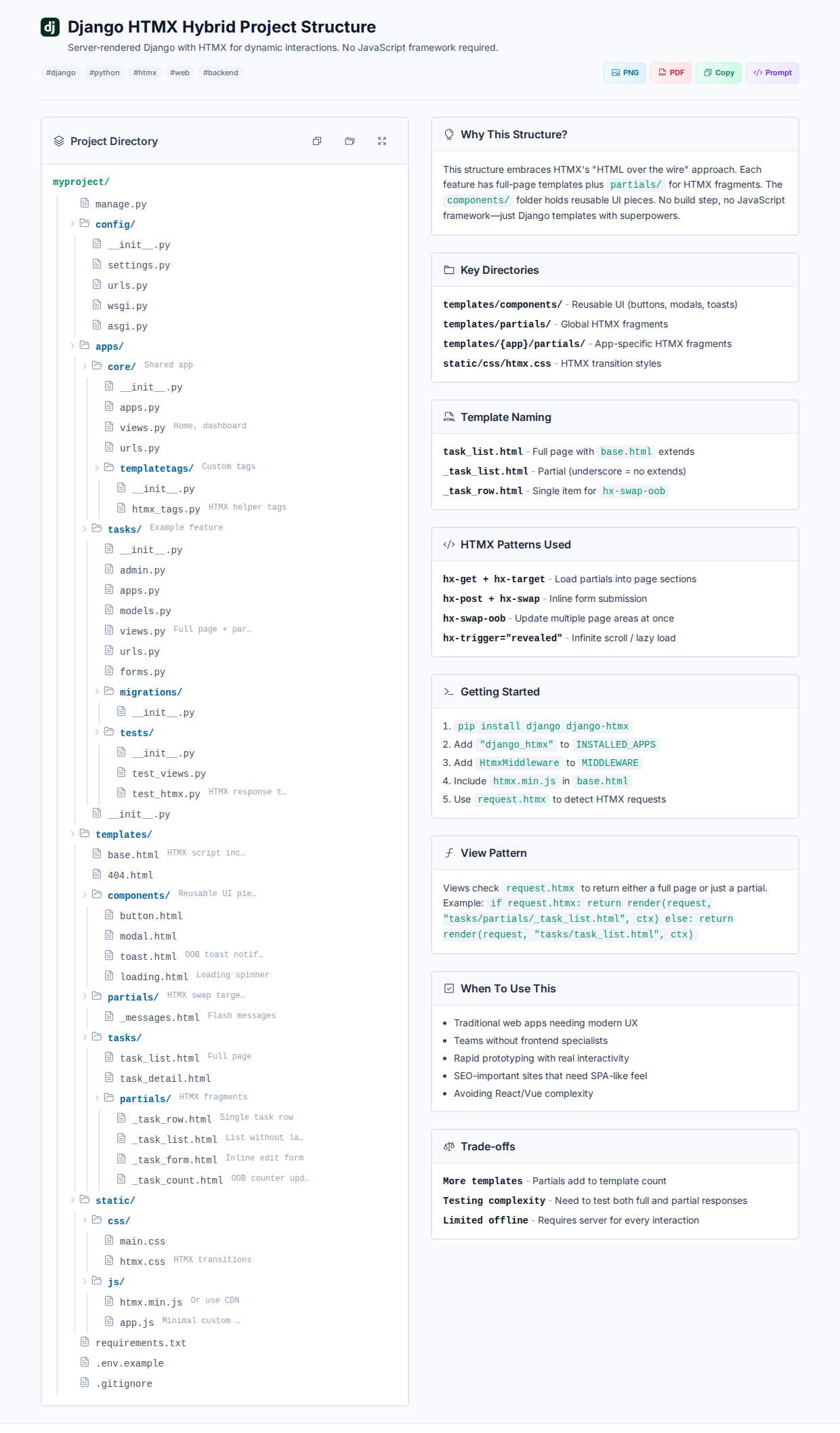 This structure embraces HTMX's "HTML over the wire" approach. Each feature has full-page templates plus partials/ for HTMX fragments. The components/ folder holds reusable UI pieces. No build step, no JavaScript framework—just Django templates with superpowers.