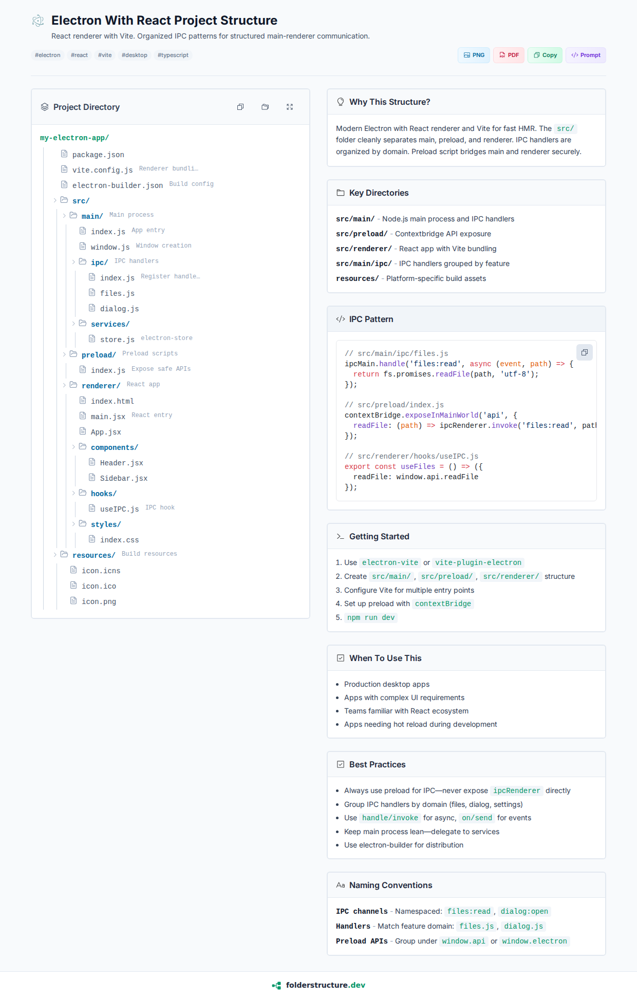 Modern Electron with React renderer and Vite for fast HMR. The src/ folder cleanly separates main, preload, and renderer. IPC handlers are organized by domain. Preload script bridges main and renderer securely.