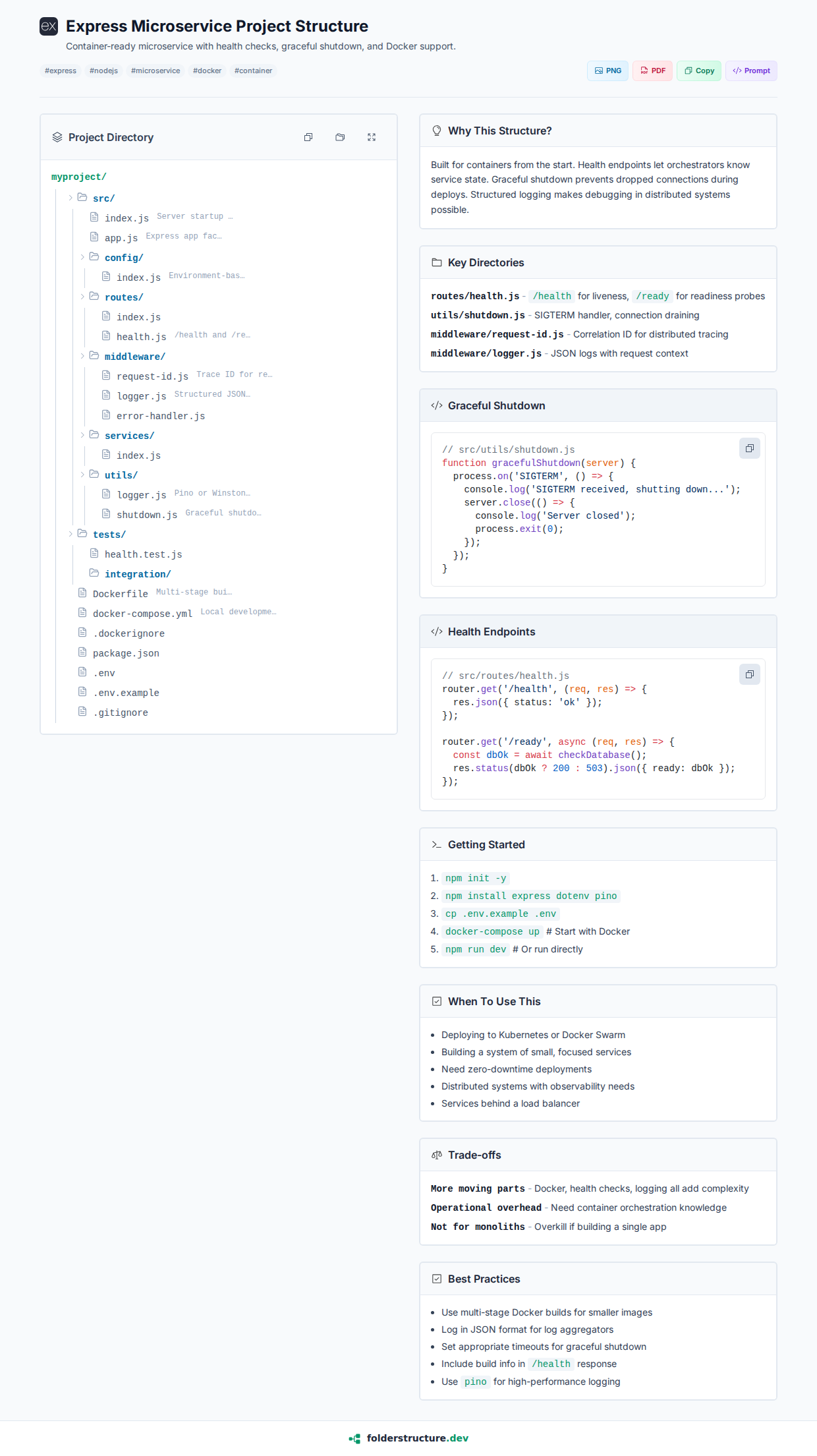 Built for containers from the start. Health endpoints let orchestrators know service state. Graceful shutdown prevents dropped connections during deploys. Structured logging makes debugging in distributed systems possible.