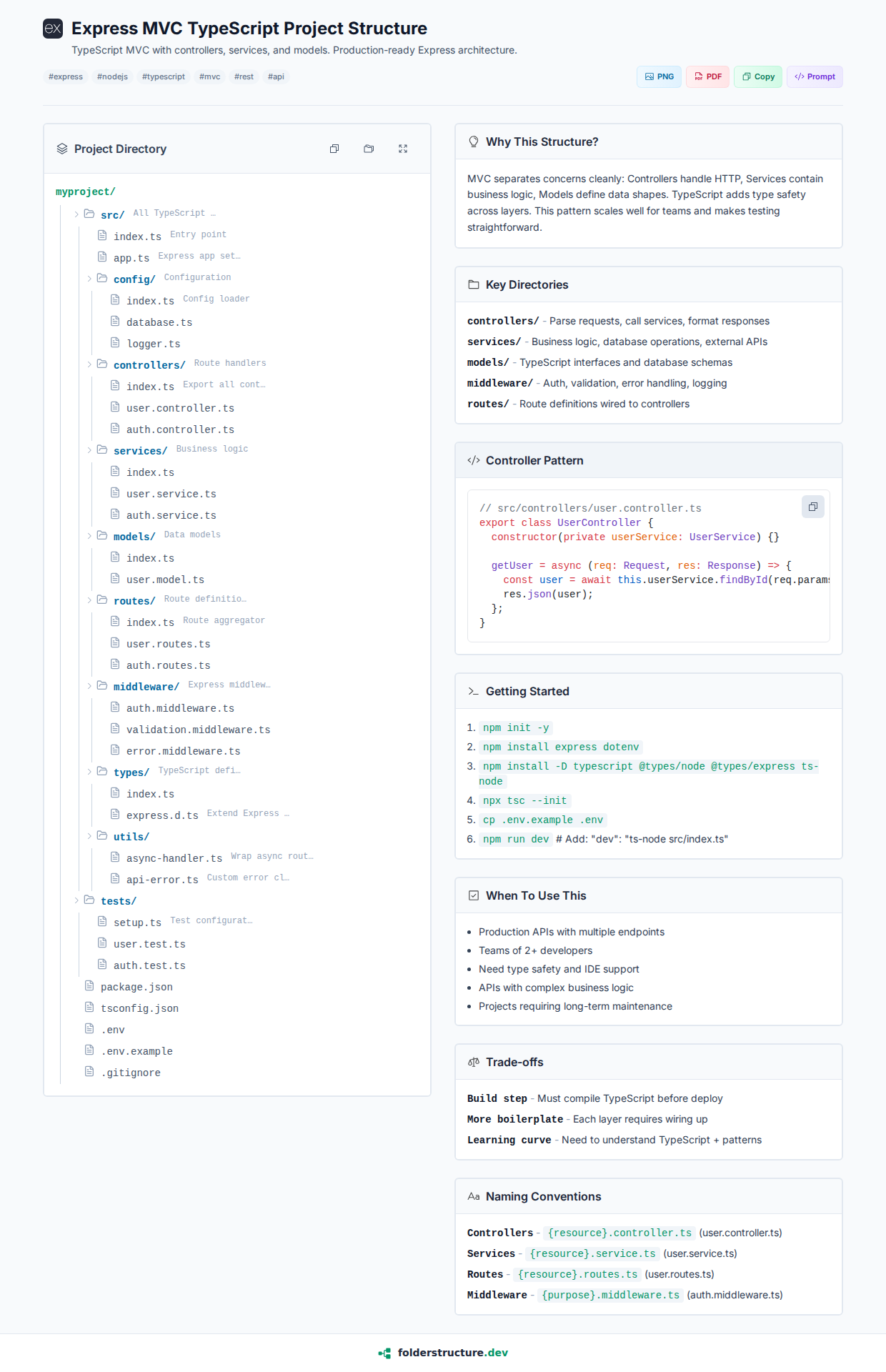 TypeScript MVC with controllers, services, and models. Production-ready Express architecture.