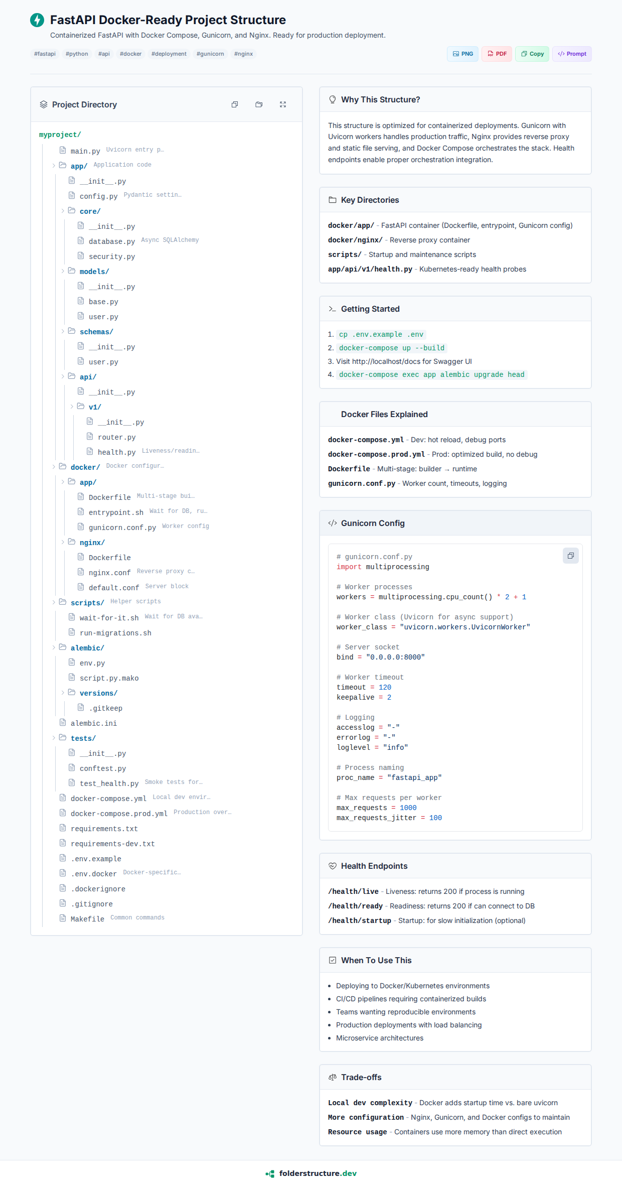This structure is optimized for containerized deployments. Gunicorn with Uvicorn workers handles production traffic, Nginx provides reverse proxy and static file serving, and Docker Compose orchestrates the stack. Health endpoints enable proper orchestration integration.