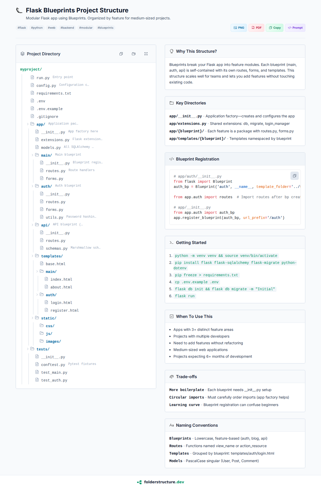 - Blueprints-Lowercase, feature-based (auth, blog, api)