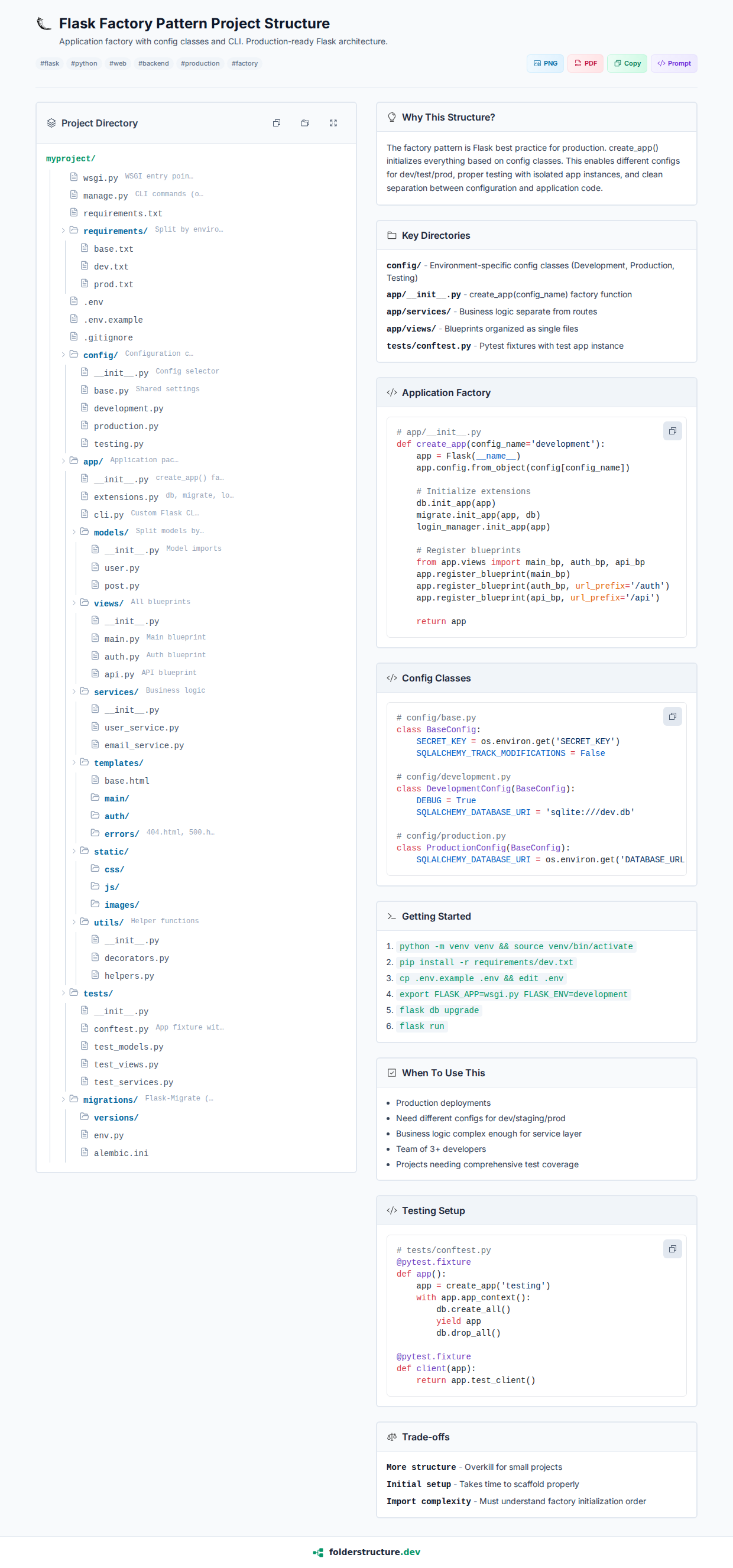 Application factory with config classes and CLI. Production-ready Flask architecture.