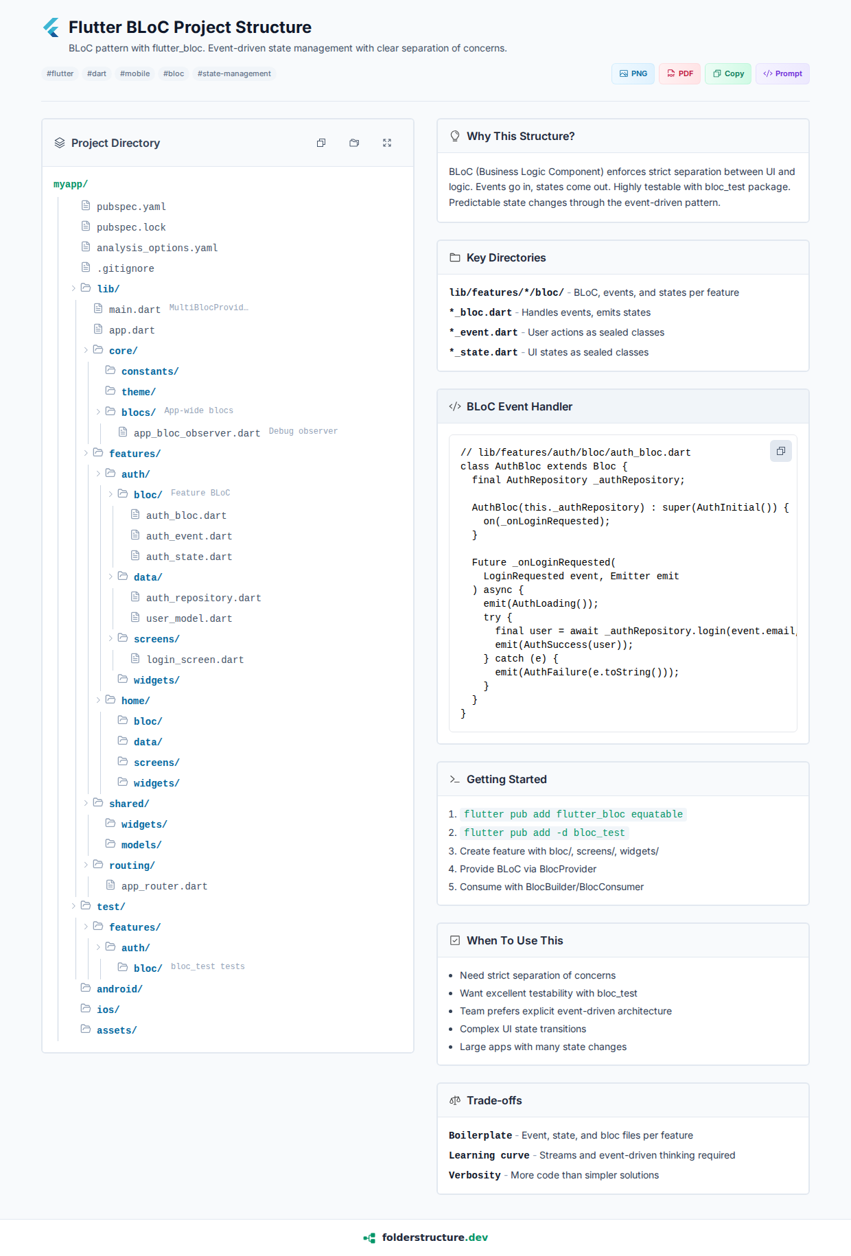 flutter pub add flutter_bloc equatableflutter pub add -d bloc_test- Create feature with bloc/, screens/, widgets/