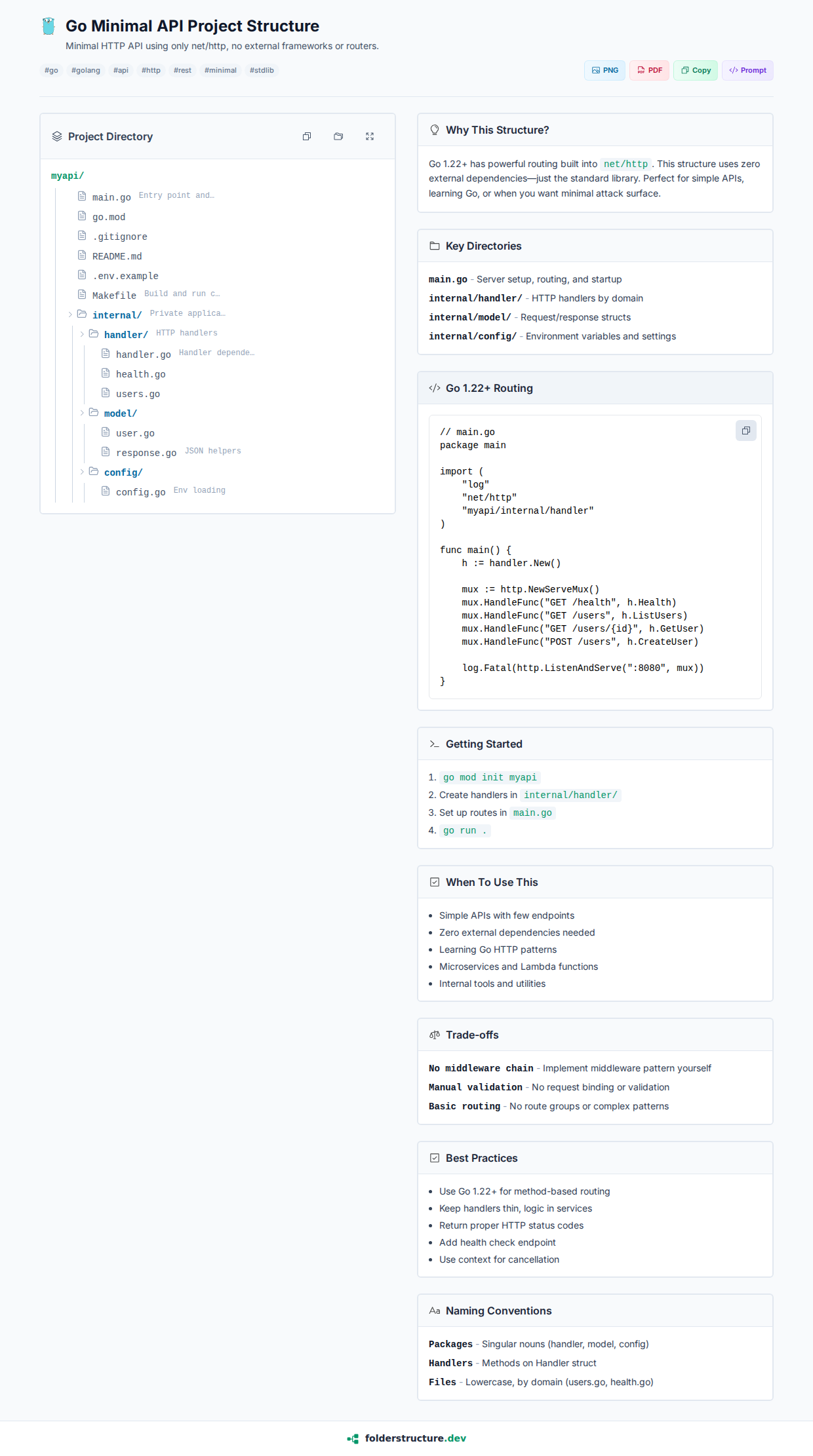 Go 1.22+ has powerful routing built into net/http. This structure uses zero external dependencies—just the standard library. Perfect for simple APIs, learning Go, or when you want minimal attack surface.