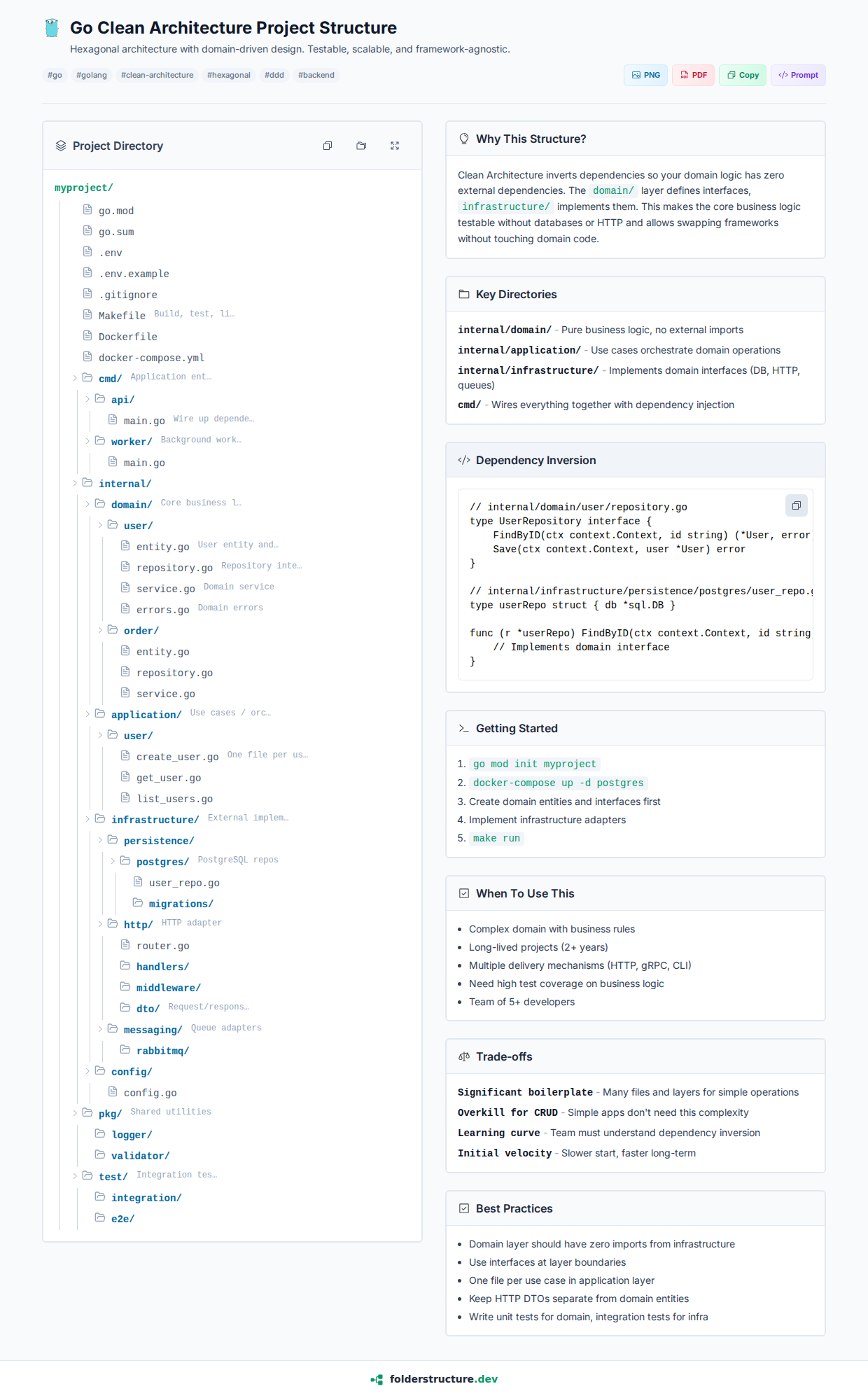 Clean Architecture inverts dependencies so your domain logic has zero external dependencies. The domain/ layer defines interfaces, infrastructure/ implements them. This makes the core business logic testable without databases or HTTP and allows swapping frameworks without touching domain code.