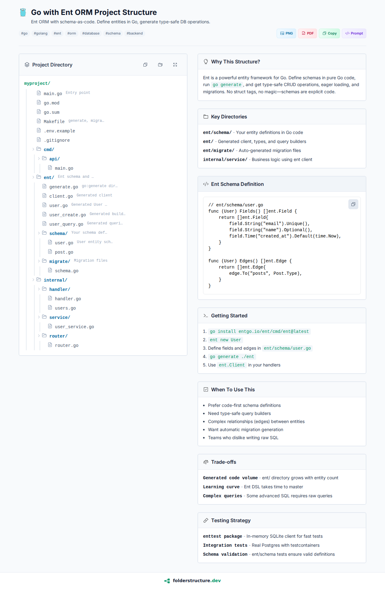 Ent ORM with schema-as-code. Define entities in Go, generate type-safe DB operations.
