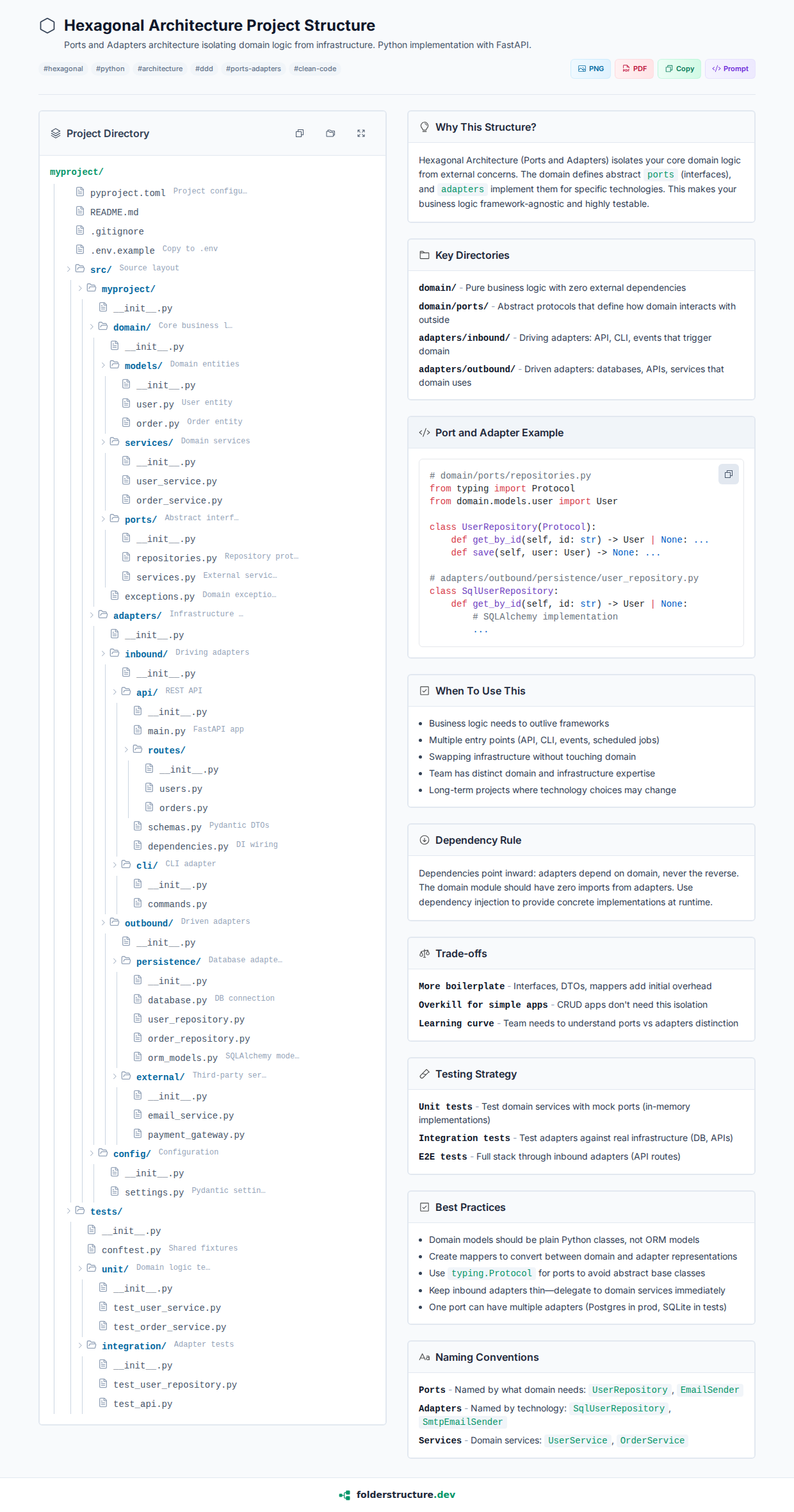 Ports and Adapters architecture isolating domain logic from infrastructure. Python implementation with FastAPI.