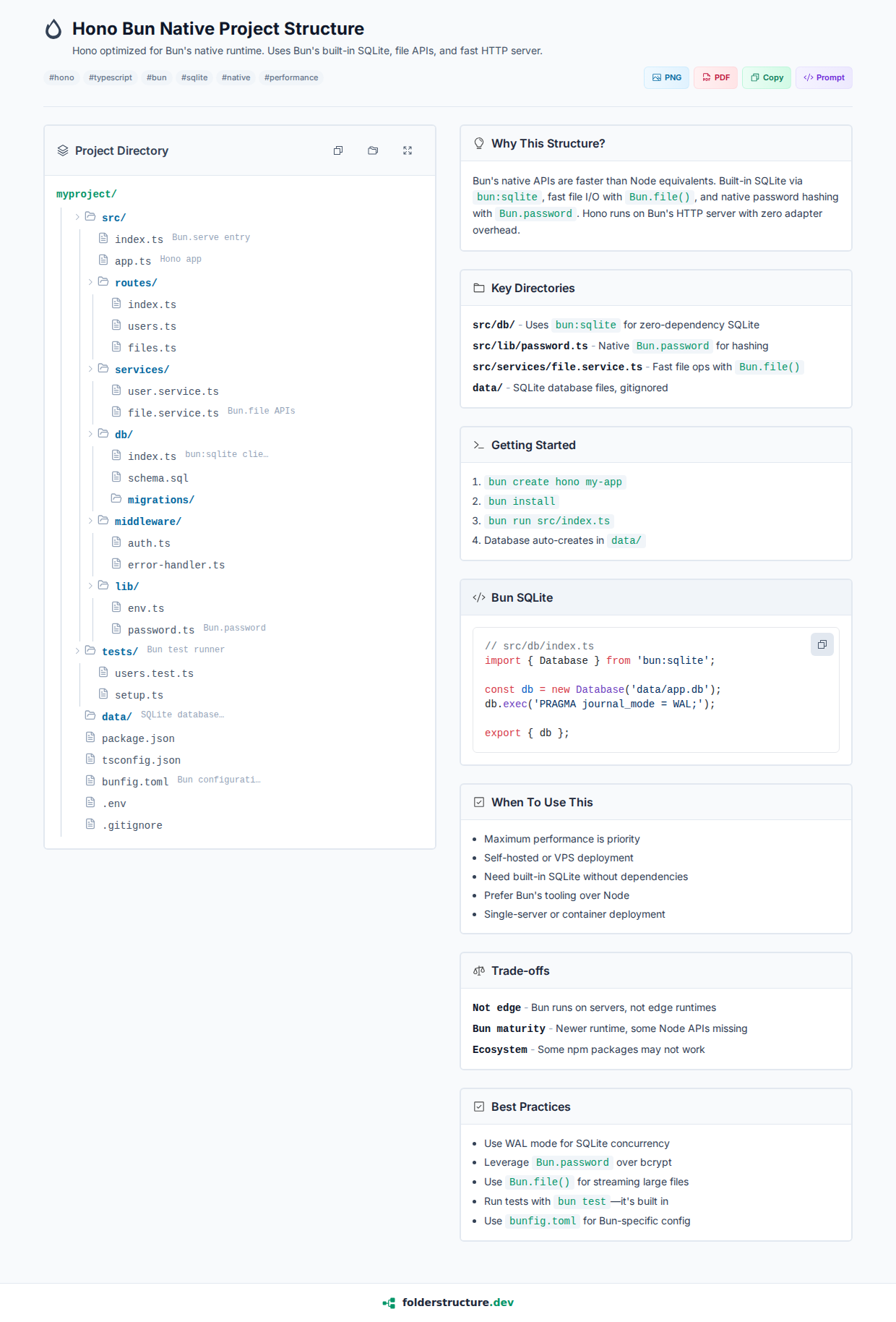 Bun's native APIs are faster than Node equivalents. Built-in SQLite via bun:sqlite, fast file I/O with Bun.file(), and native password hashing with Bun.password. Hono runs on Bun's HTTP server with zero adapter overhead.