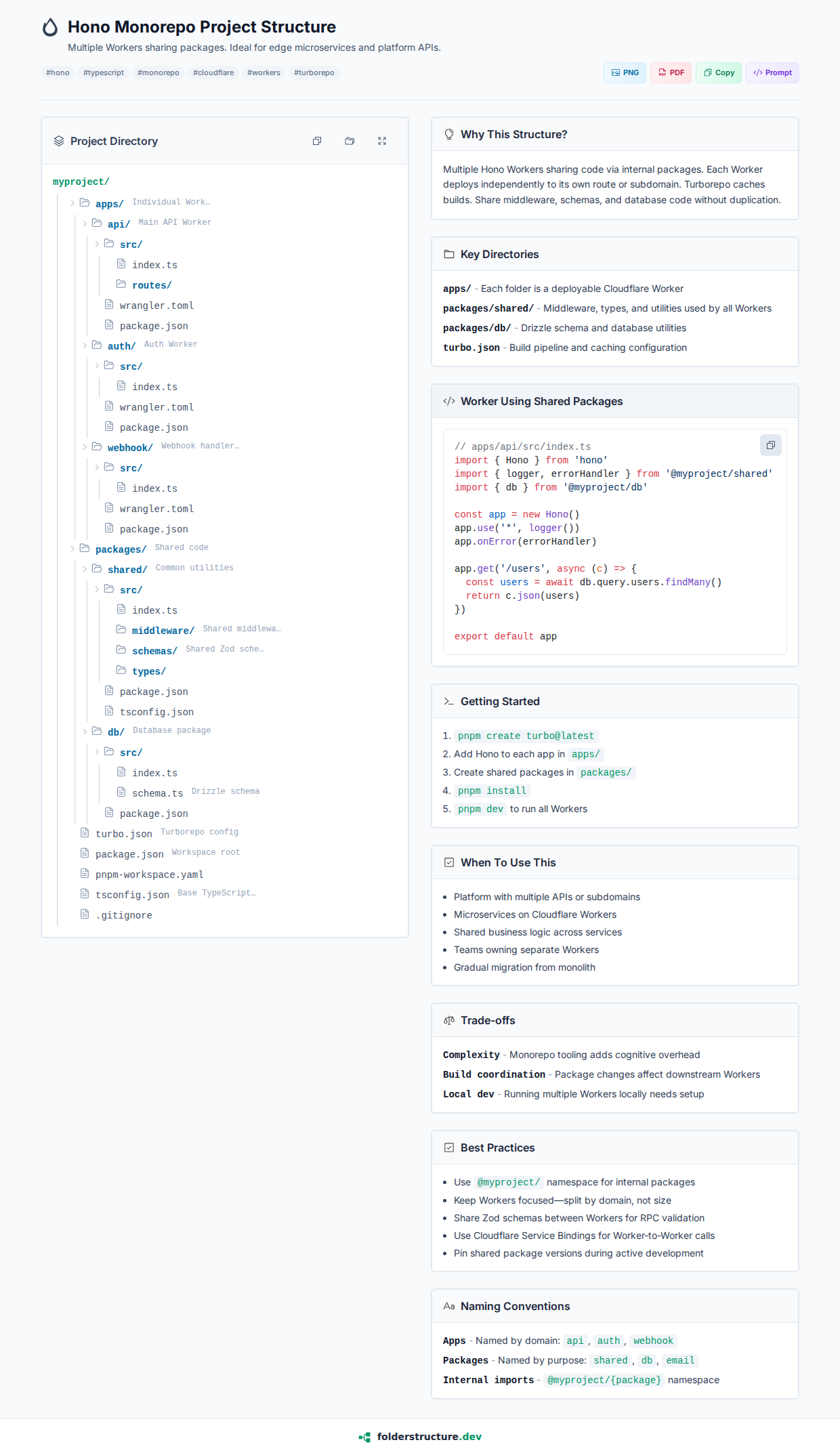 Multiple Hono Workers sharing code via internal packages. Each Worker deploys independently to its own route or subdomain. Turborepo caches builds. Share middleware, schemas, and database code without duplication.