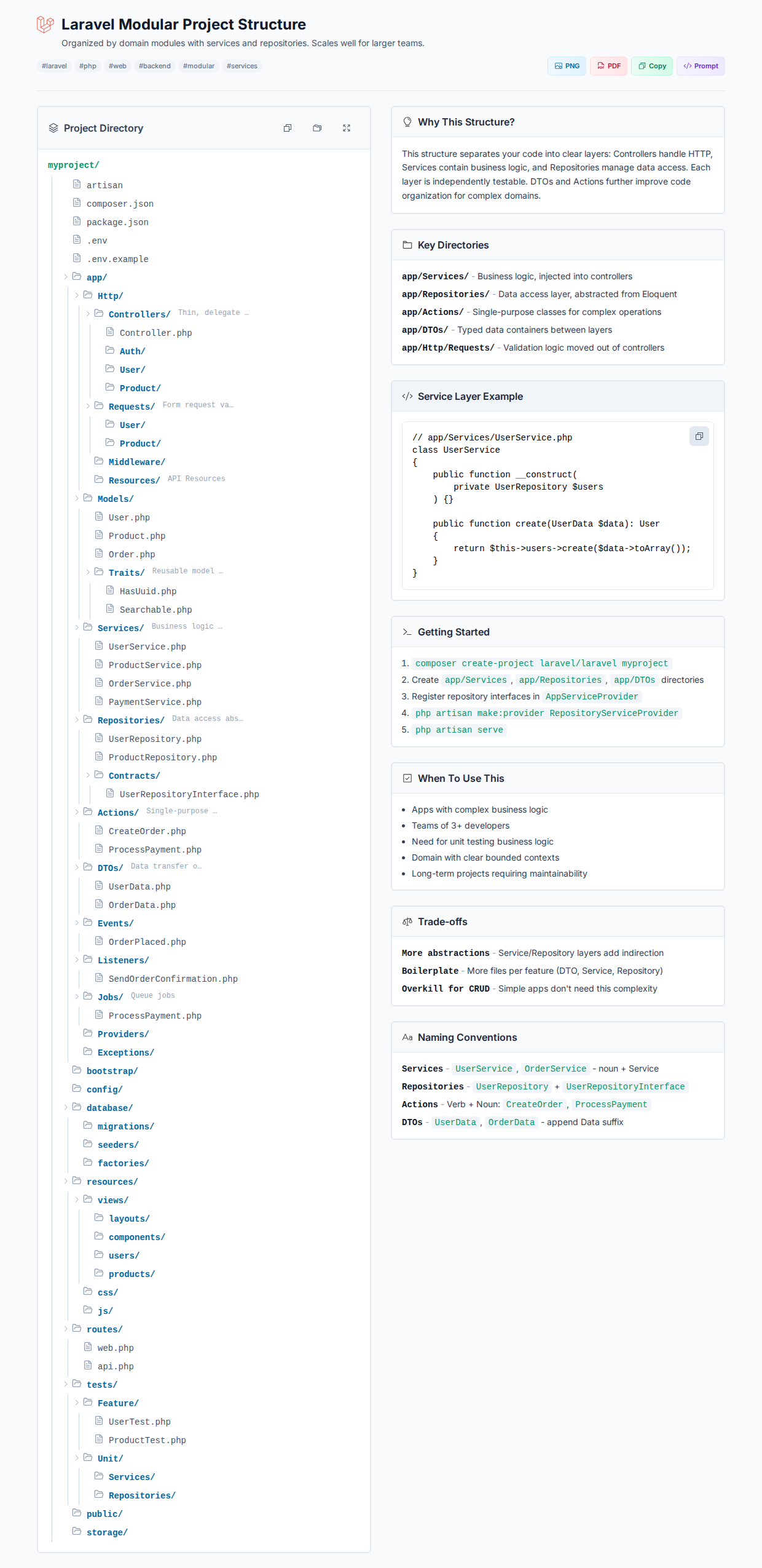 This structure separates your code into clear layers: Controllers handle HTTP, Services contain business logic, and Repositories manage data access. Each layer is independently testable. DTOs and Actions further improve code organization for complex domains.
