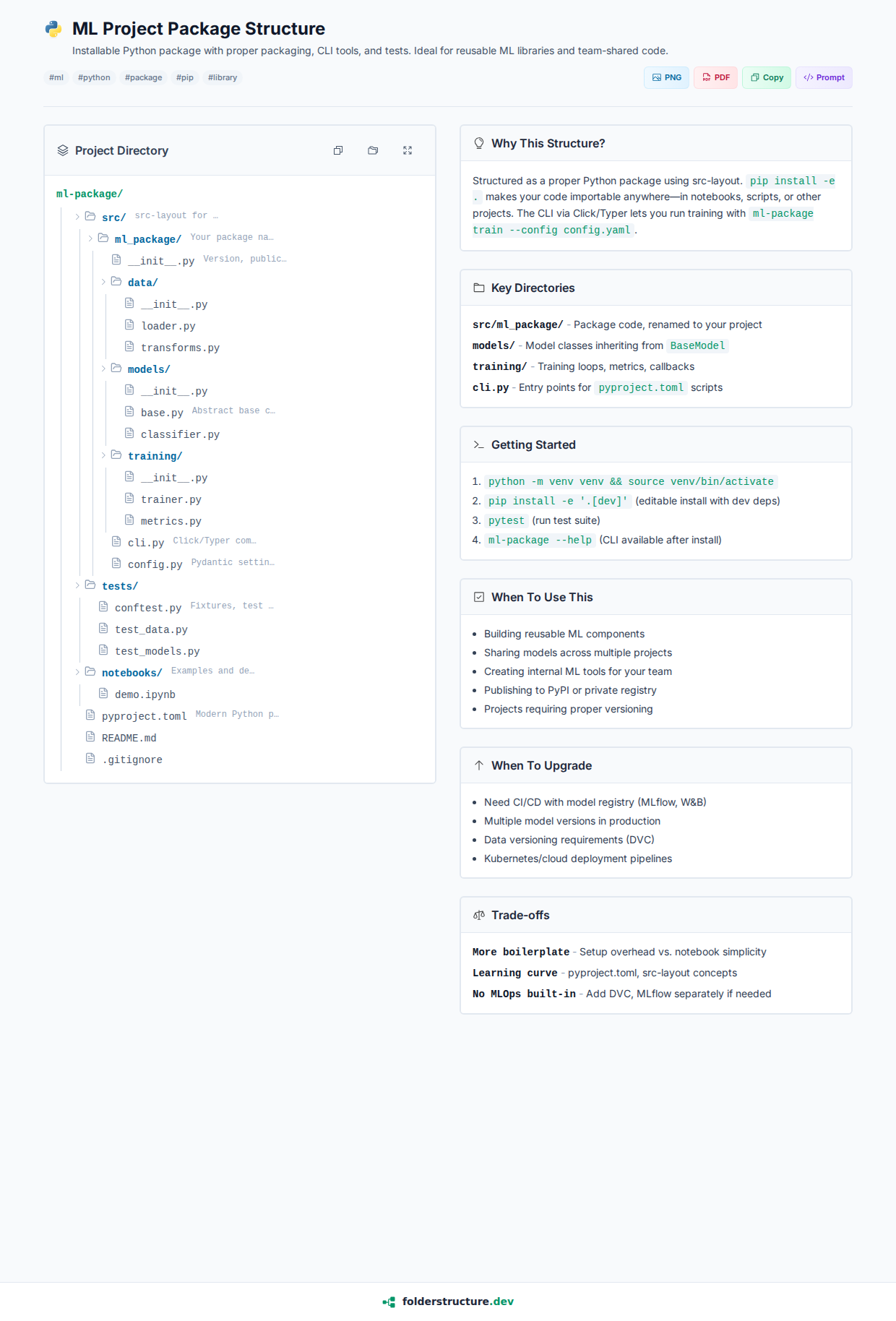Structured as a proper Python package using src-layout. pip install -e . makes your code importable anywhere—in notebooks, scripts, or other projects. The CLI via Click/Typer lets you run training with ml-package train --config config.yaml.