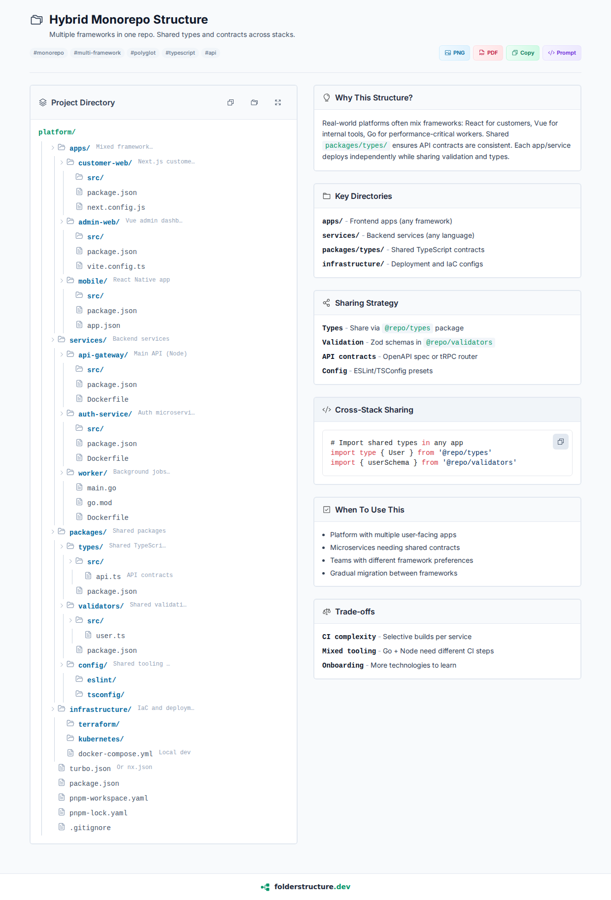 Multiple frameworks in one repo. Shared types and contracts across stacks.