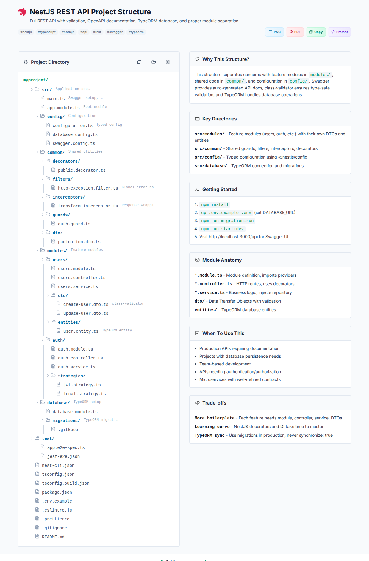 This structure separates concerns with feature modules in modules/, shared code in common/, and configuration in config/. Swagger provides auto-generated API docs, class-validator ensures type-safe validation, and TypeORM handles database operations.