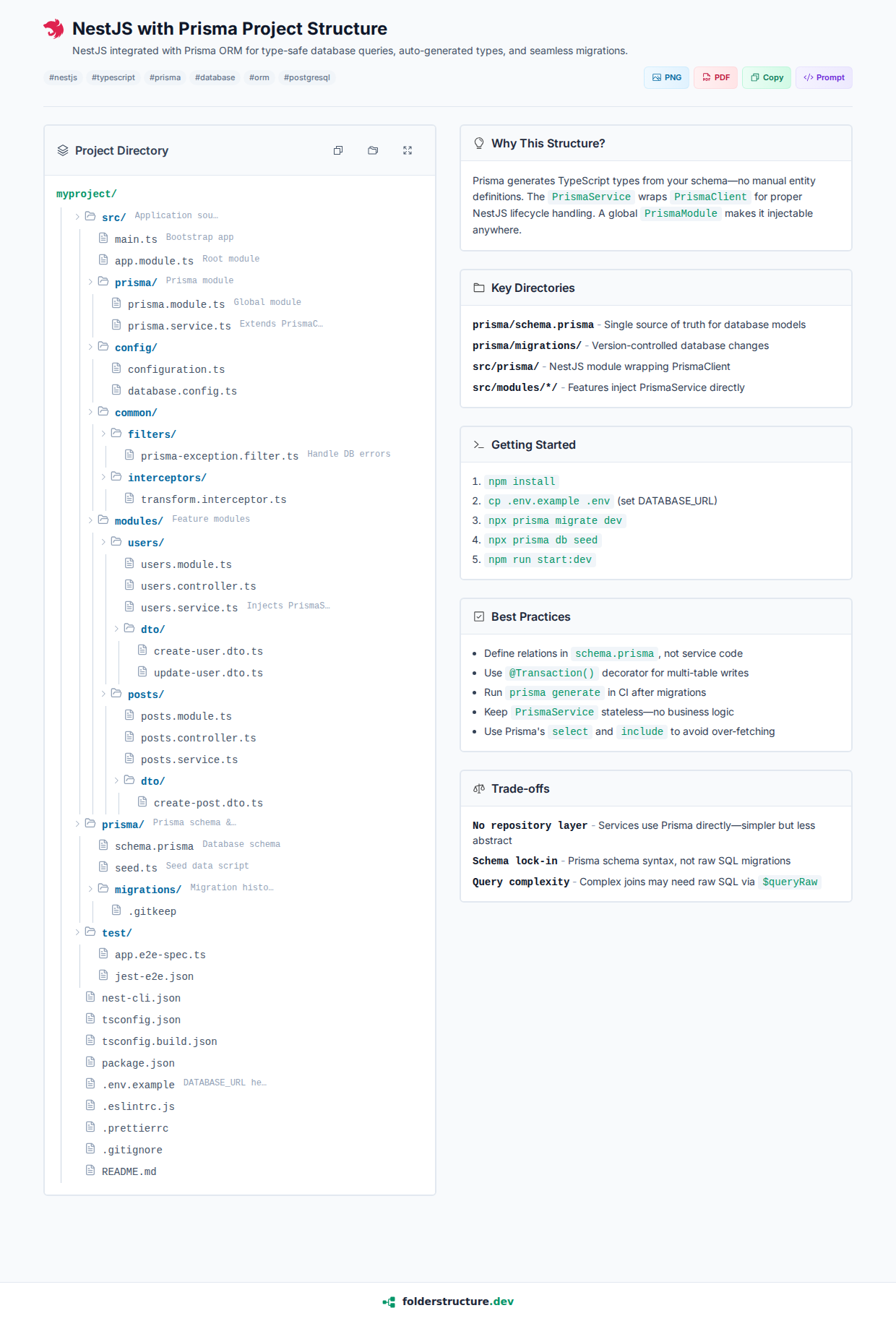 Prisma generates TypeScript types from your schema—no manual entity definitions. The PrismaService wraps PrismaClient for proper NestJS lifecycle handling. A global PrismaModule makes it injectable anywhere.
