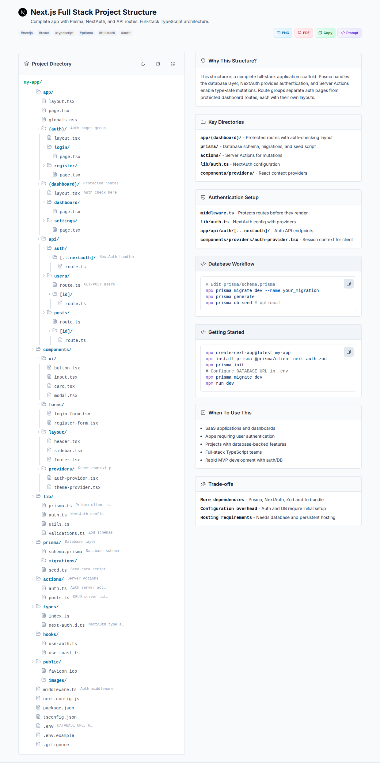 This structure is a complete full-stack application scaffold. Prisma handles the database layer, NextAuth provides authentication, and Server Actions enable type-safe mutations. Route groups separate auth pages from protected dashboard routes, each with their own layouts.