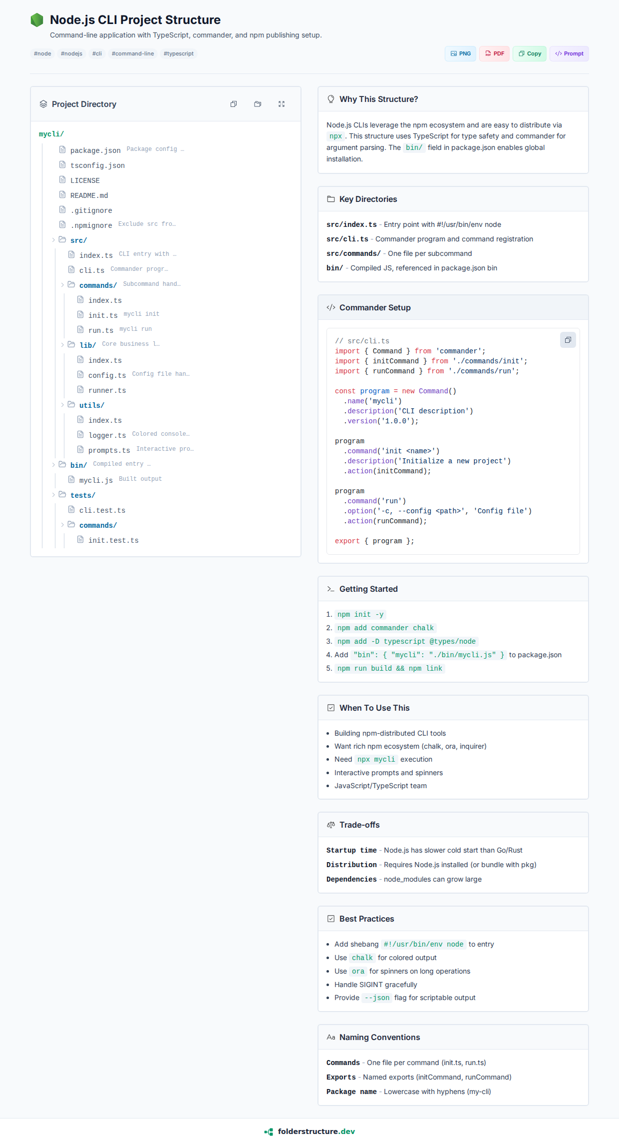 Node.js CLIs leverage the npm ecosystem and are easy to distribute via npx. This structure uses TypeScript for type safety and commander for argument parsing. The bin/ field in package.json enables global installation.