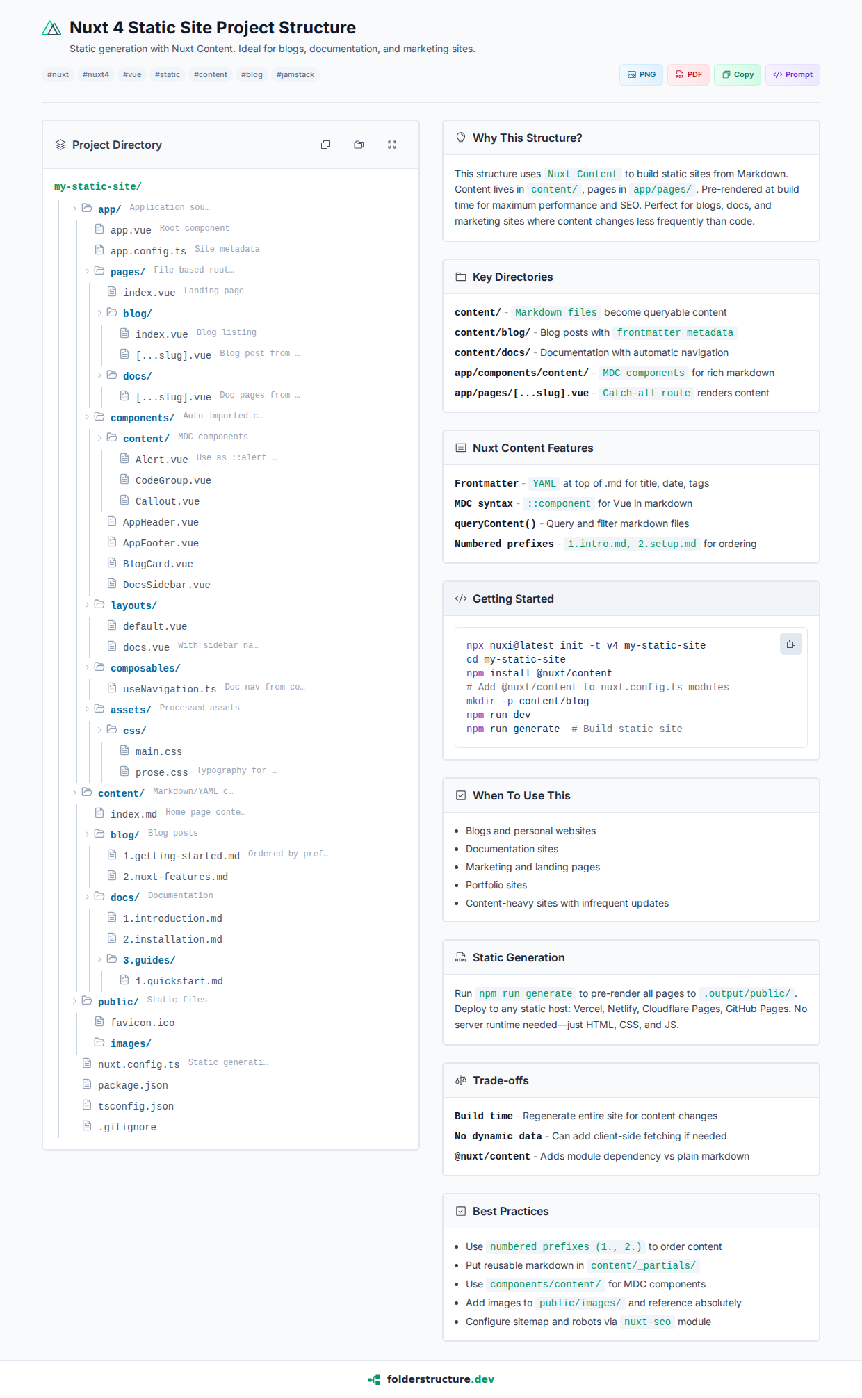 This structure uses Nuxt Content to build static sites from Markdown. Content lives in content/, pages in app/pages/. Pre-rendered at build time for maximum performance and SEO. Perfect for blogs, docs, and marketing sites where content changes less frequently than code.