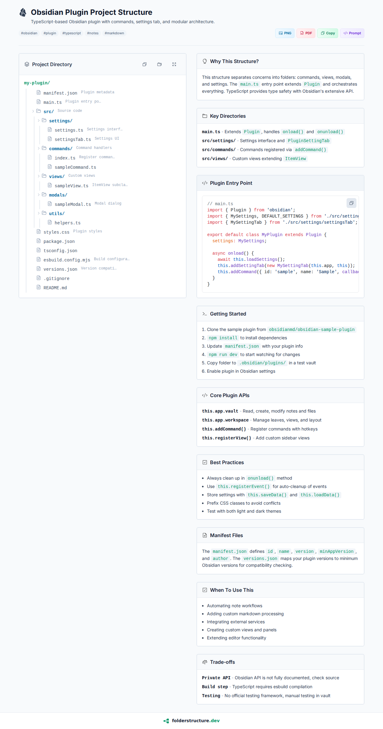 This structure separates concerns into folders: commands, views, modals, and settings. The main.ts entry point extends Plugin and orchestrates everything. TypeScript provides type safety with Obsidian's extensive API.