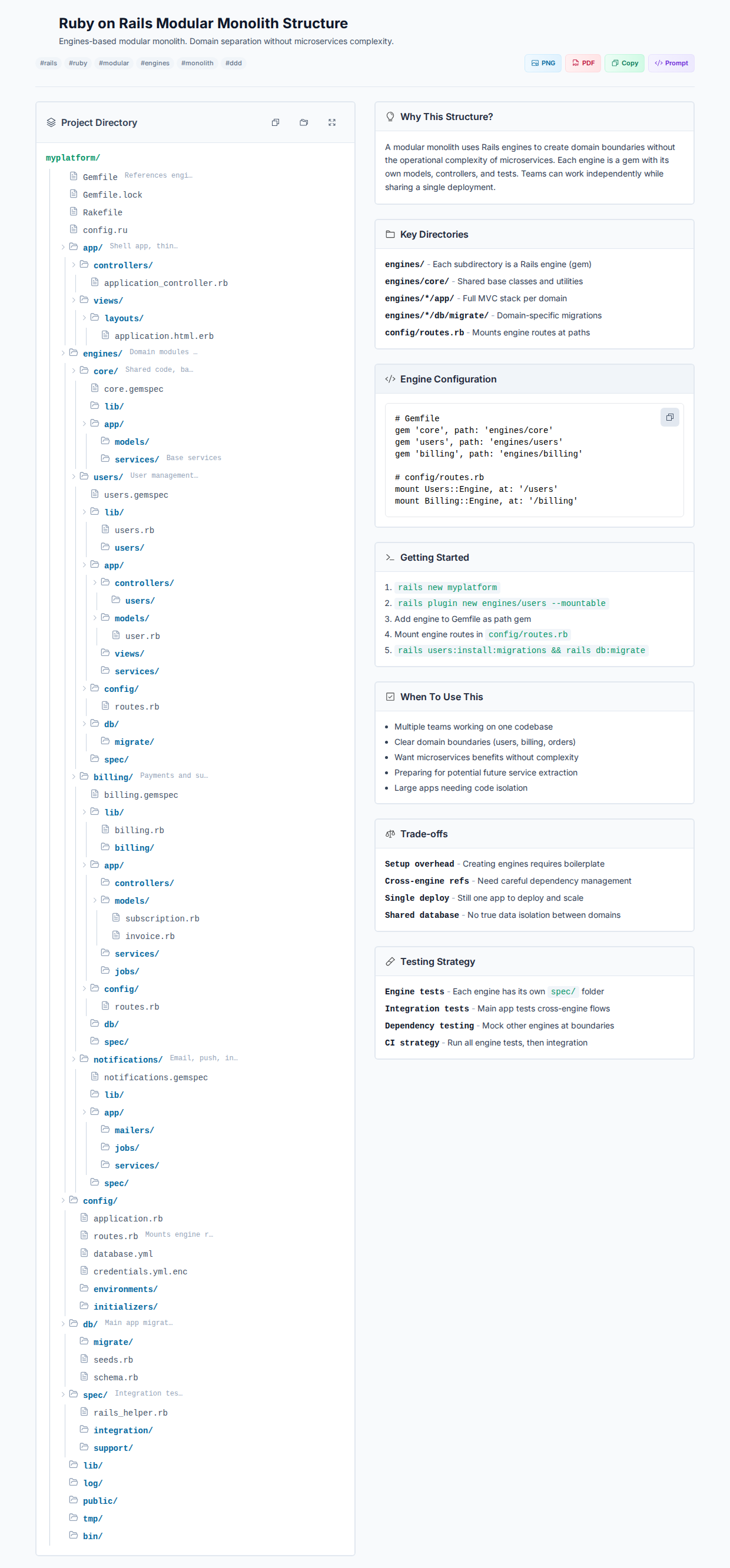 A modular monolith uses Rails engines to create domain boundaries without the operational complexity of microservices. Each engine is a gem with its own models, controllers, and tests. Teams can work independently while sharing a single deployment.